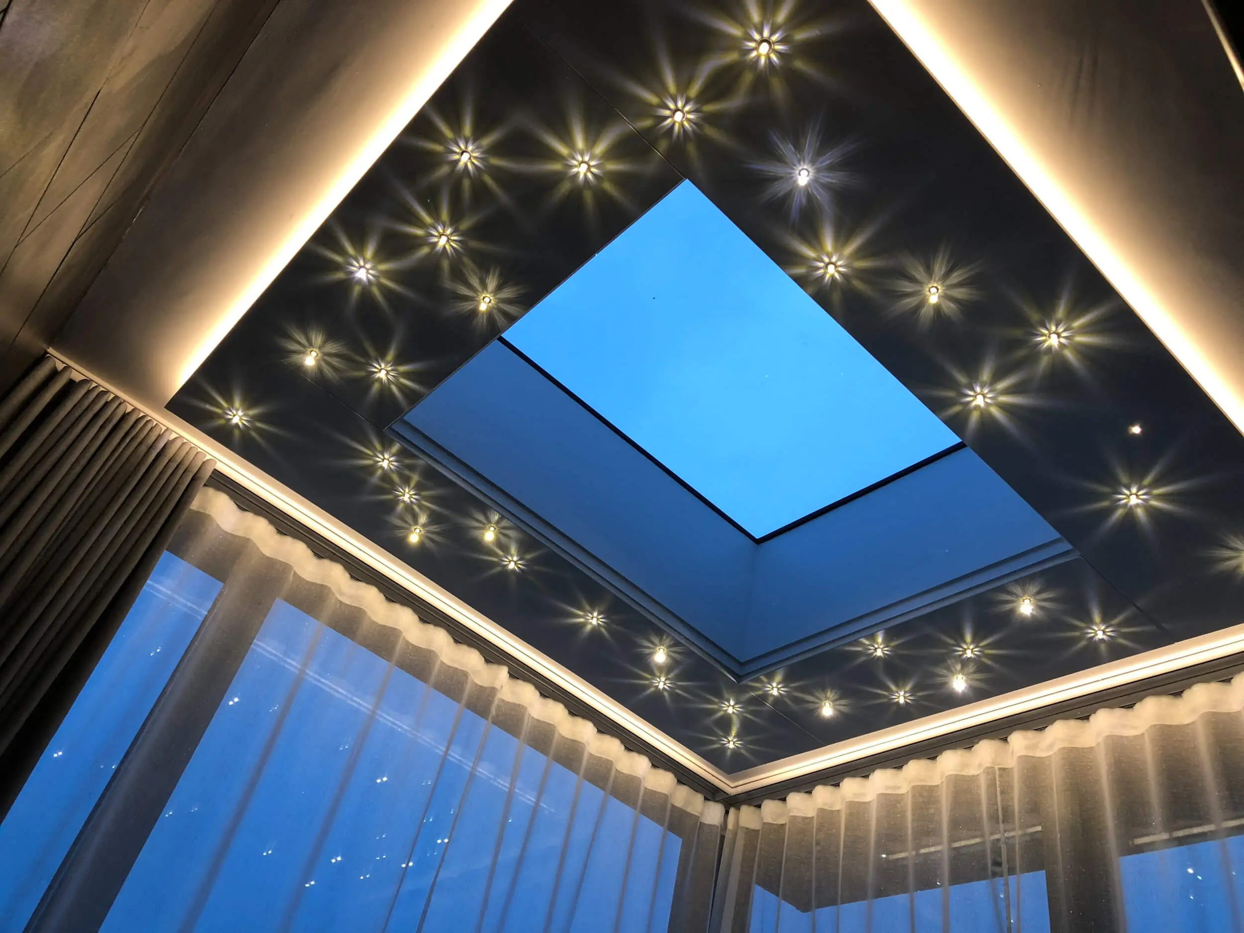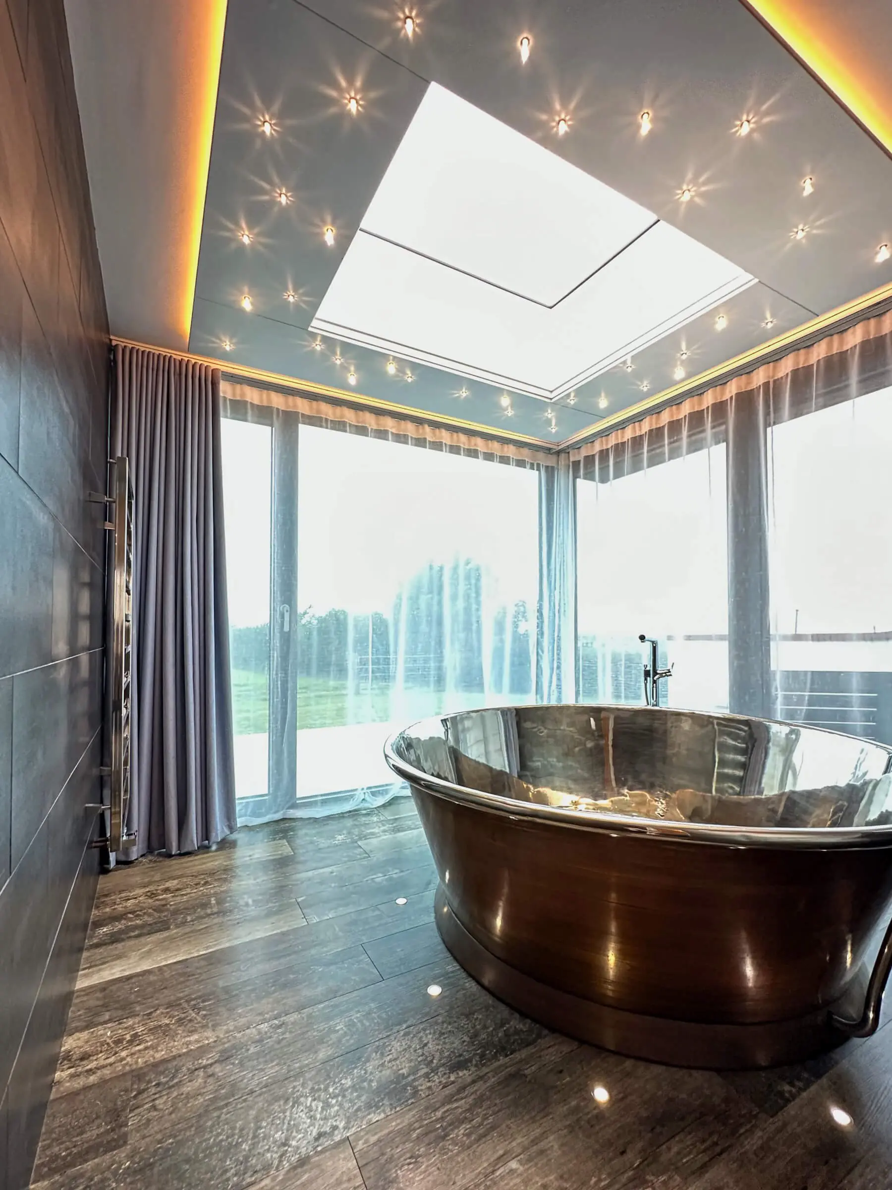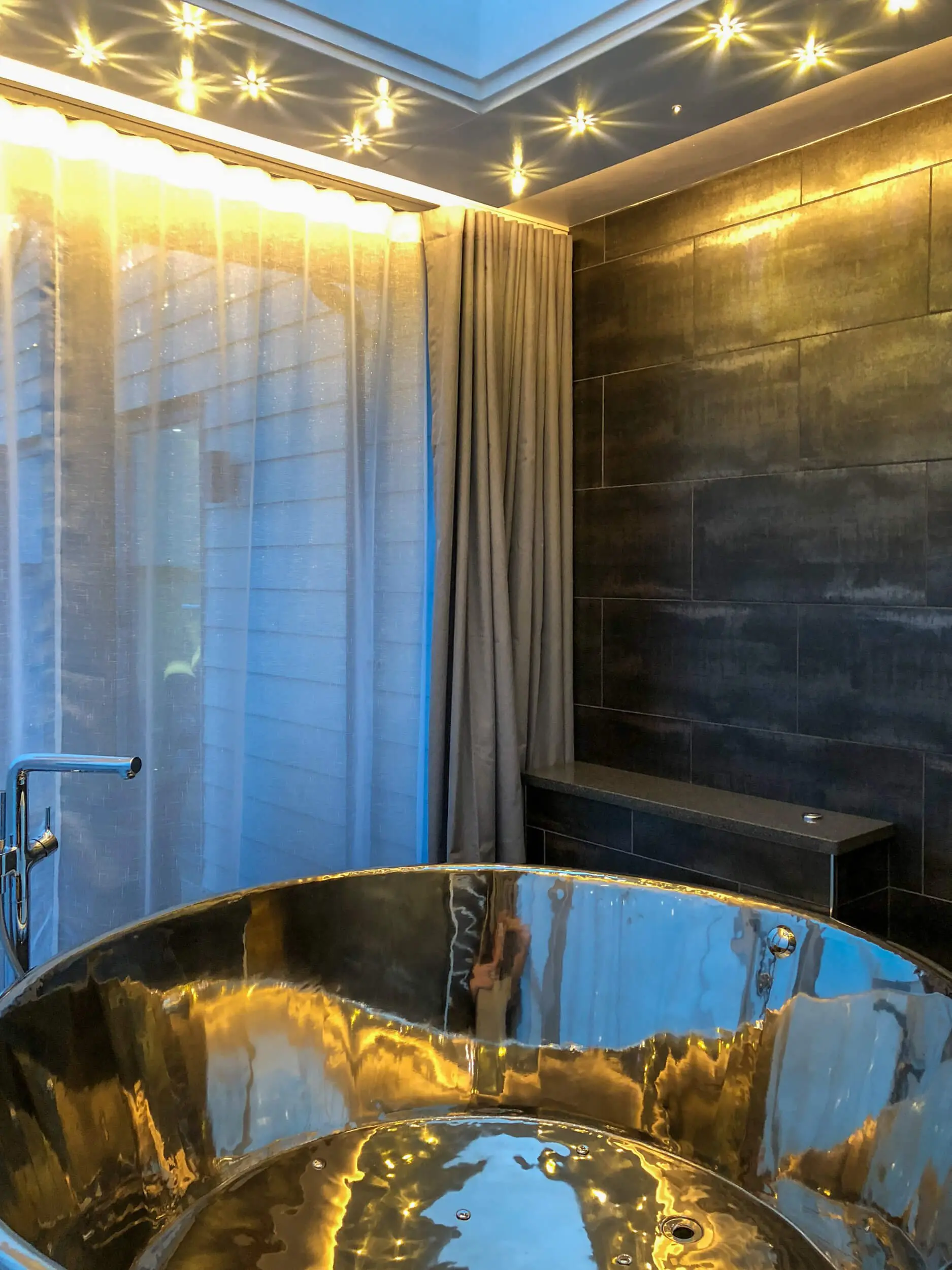 Look up through the glass ceiling to see the stars, or bask in the shimmering Swarovski® Crystal Star lighting display. With sliding doors that open to the outside, it’s a magical place to soak and unwind.