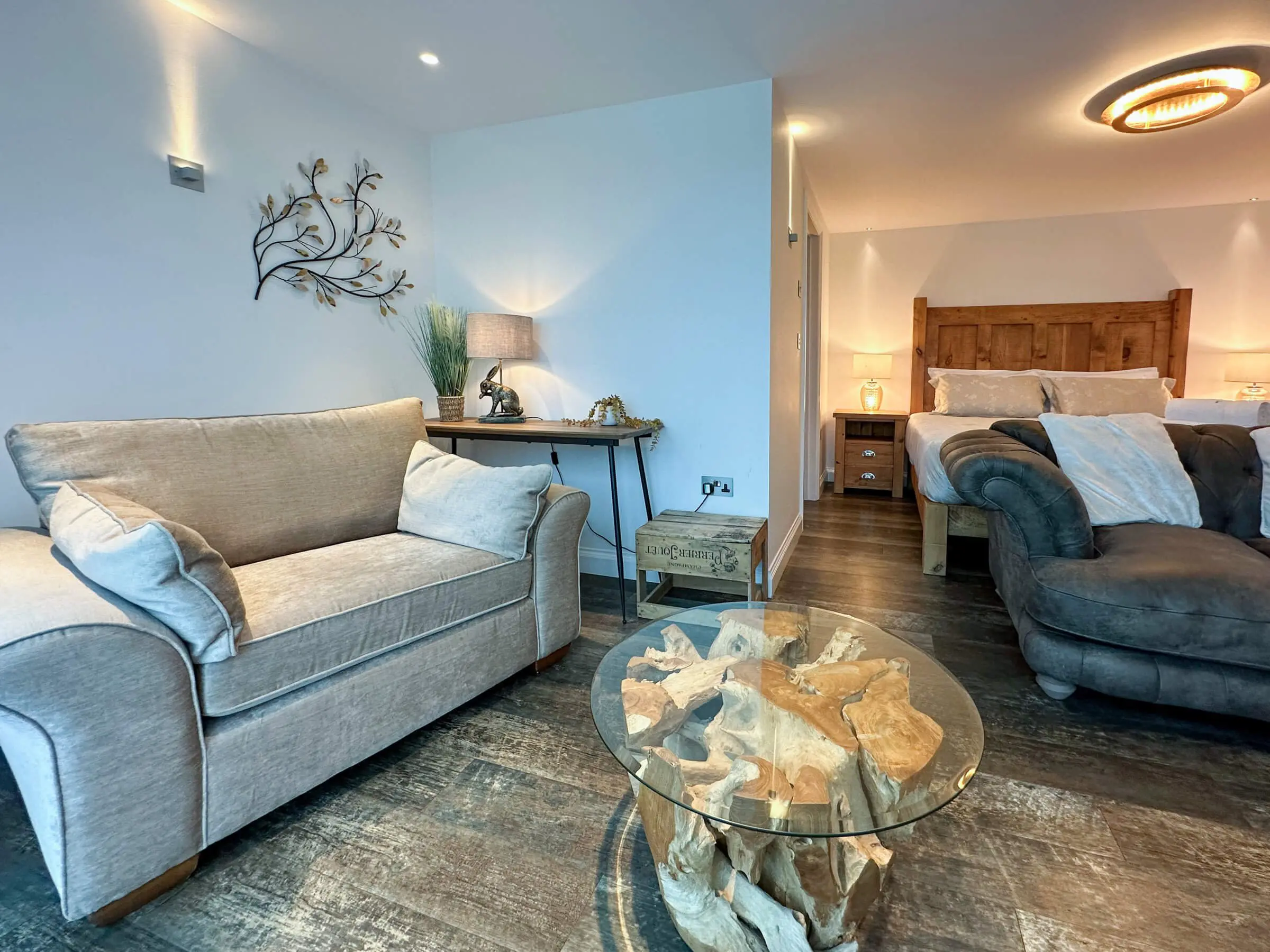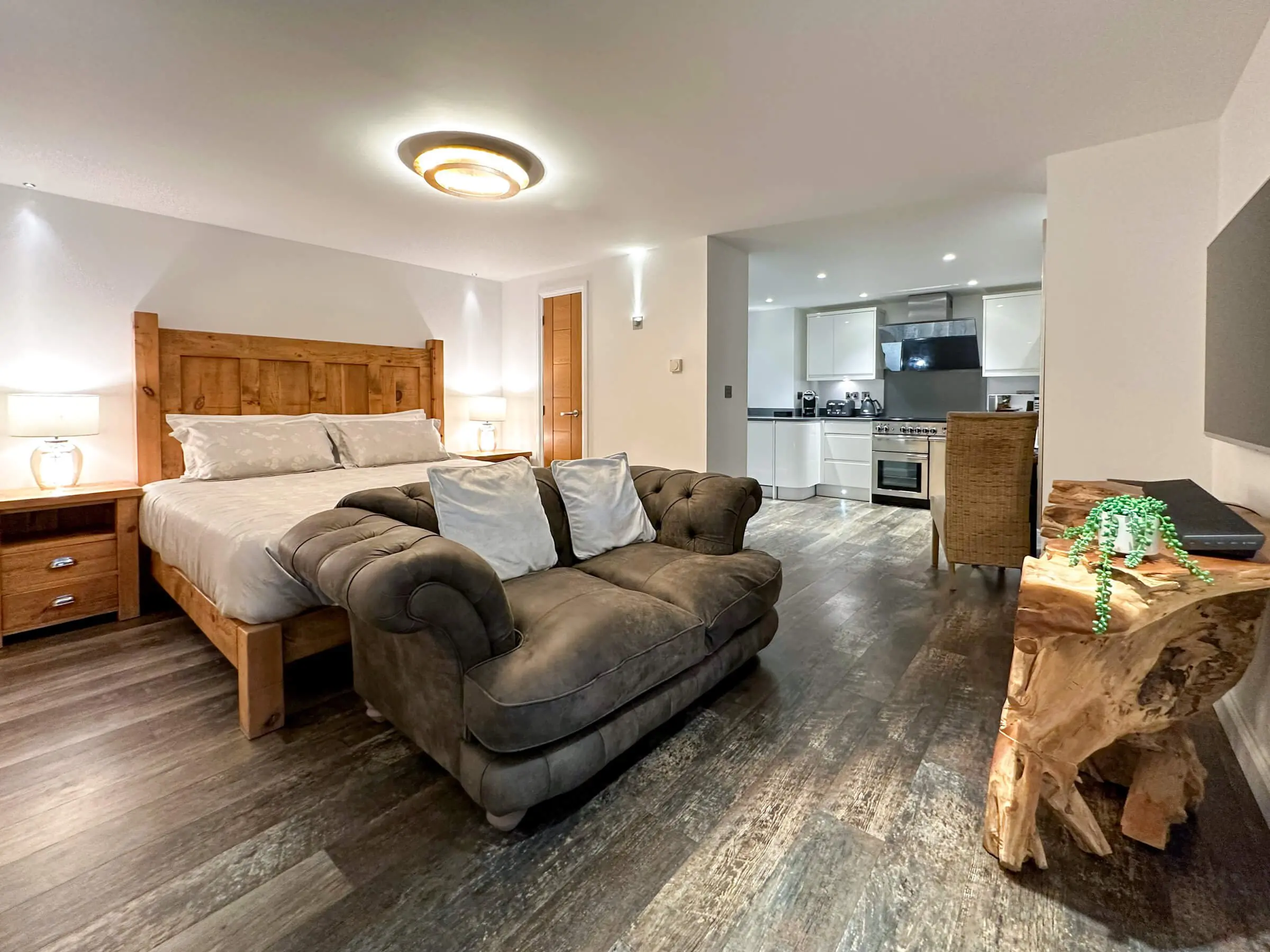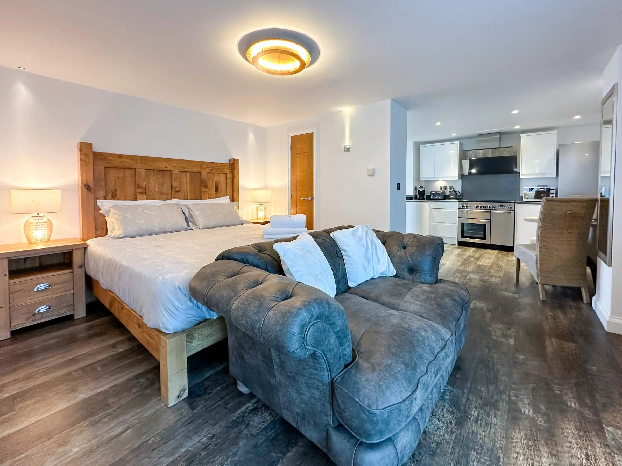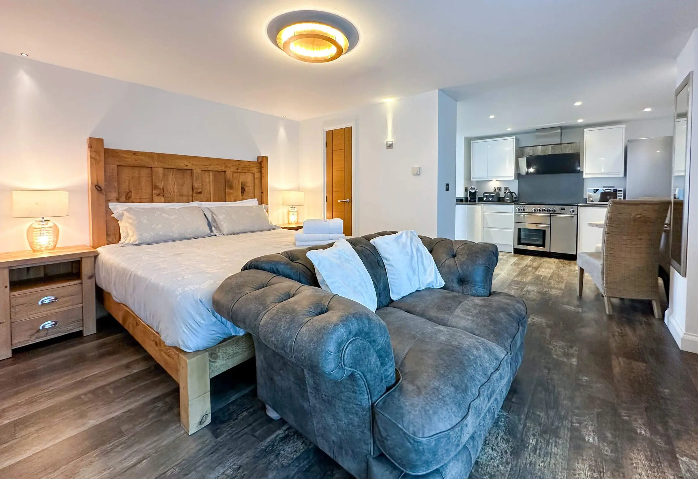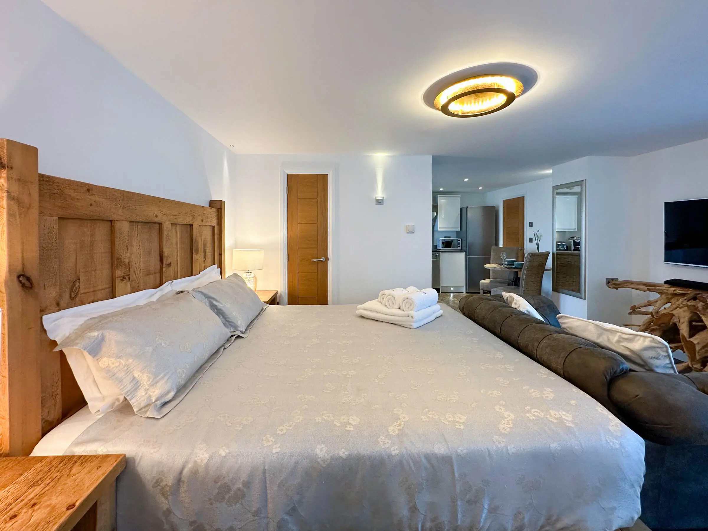 The open-plan bedroom features a handcrafted Canadian pine super-king bed, complete with a sumptuous memory foam mattress for the perfect night’s sleep.