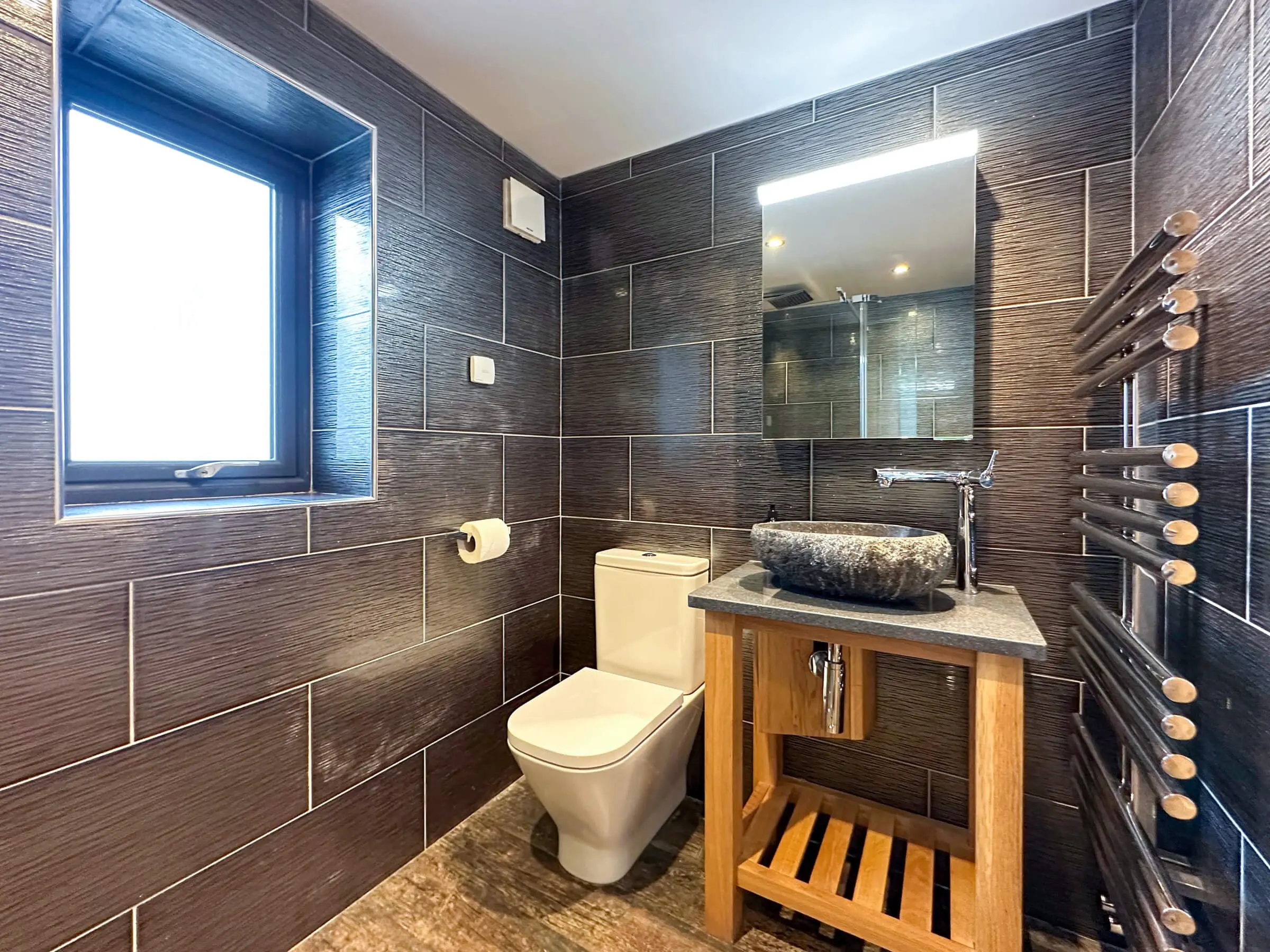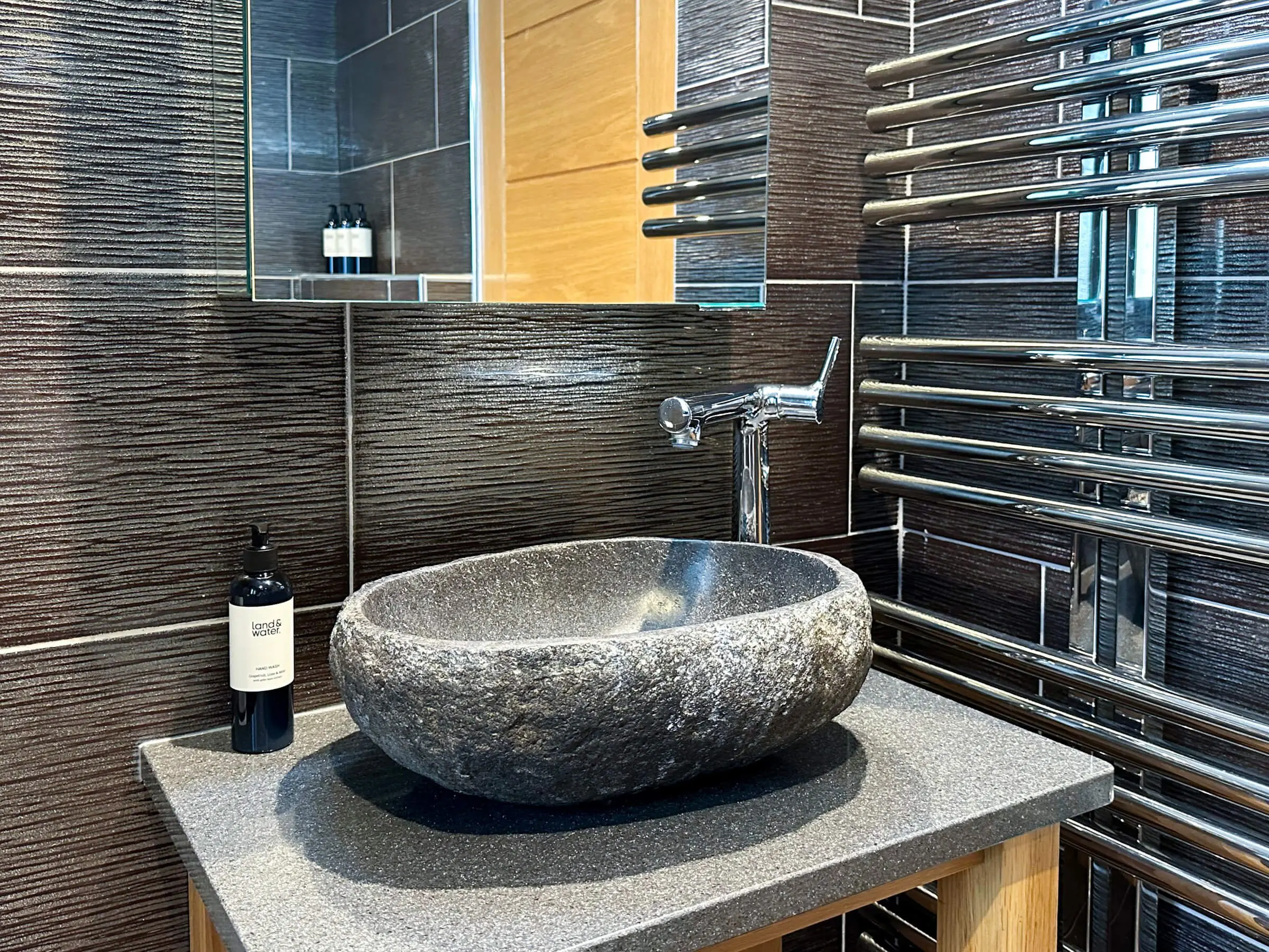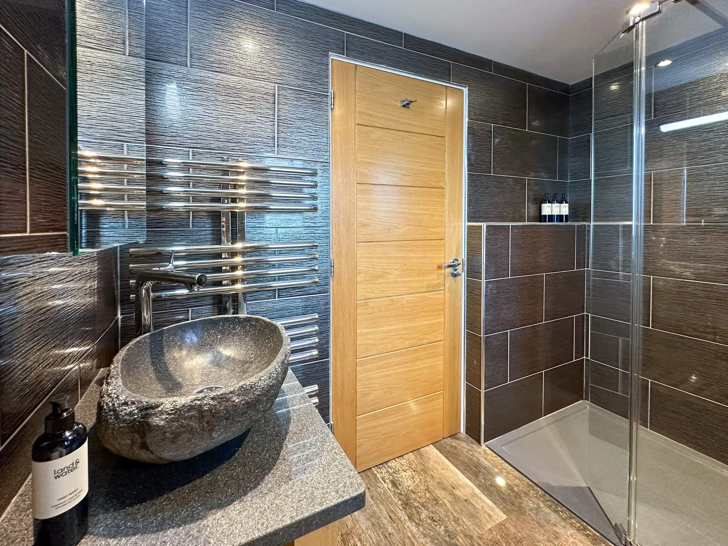The en-suite shower room features a walk-in rainfall shower, complete with locally made toiletries and bath foam.