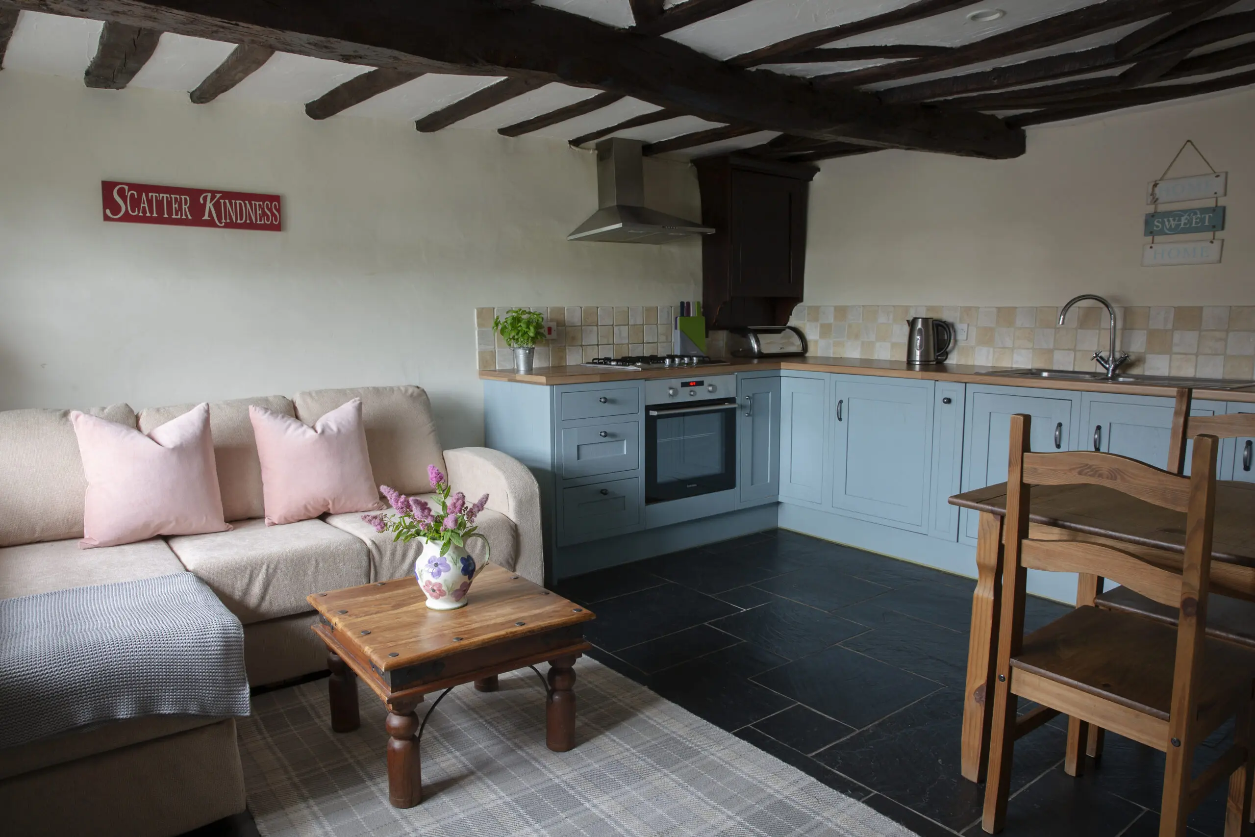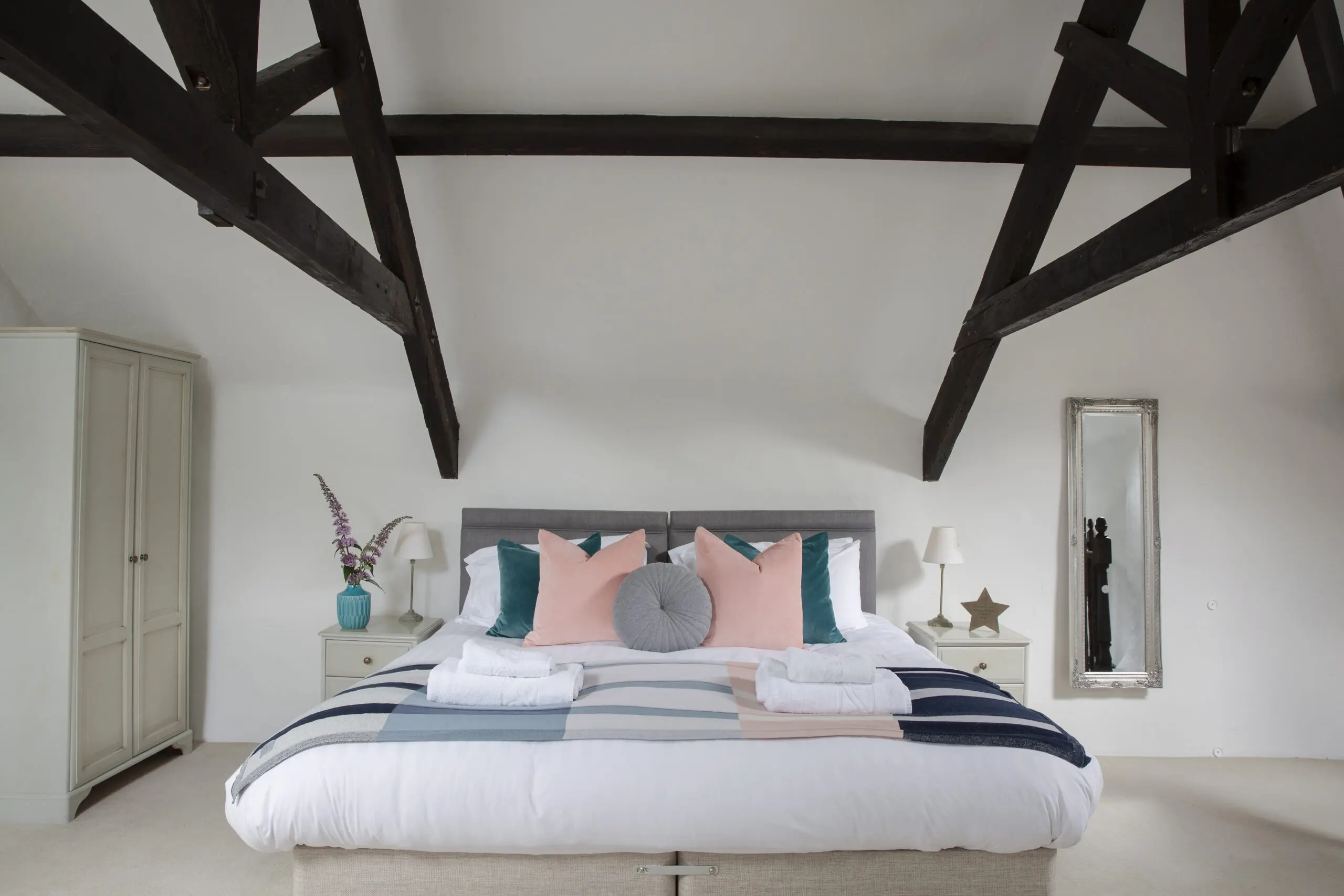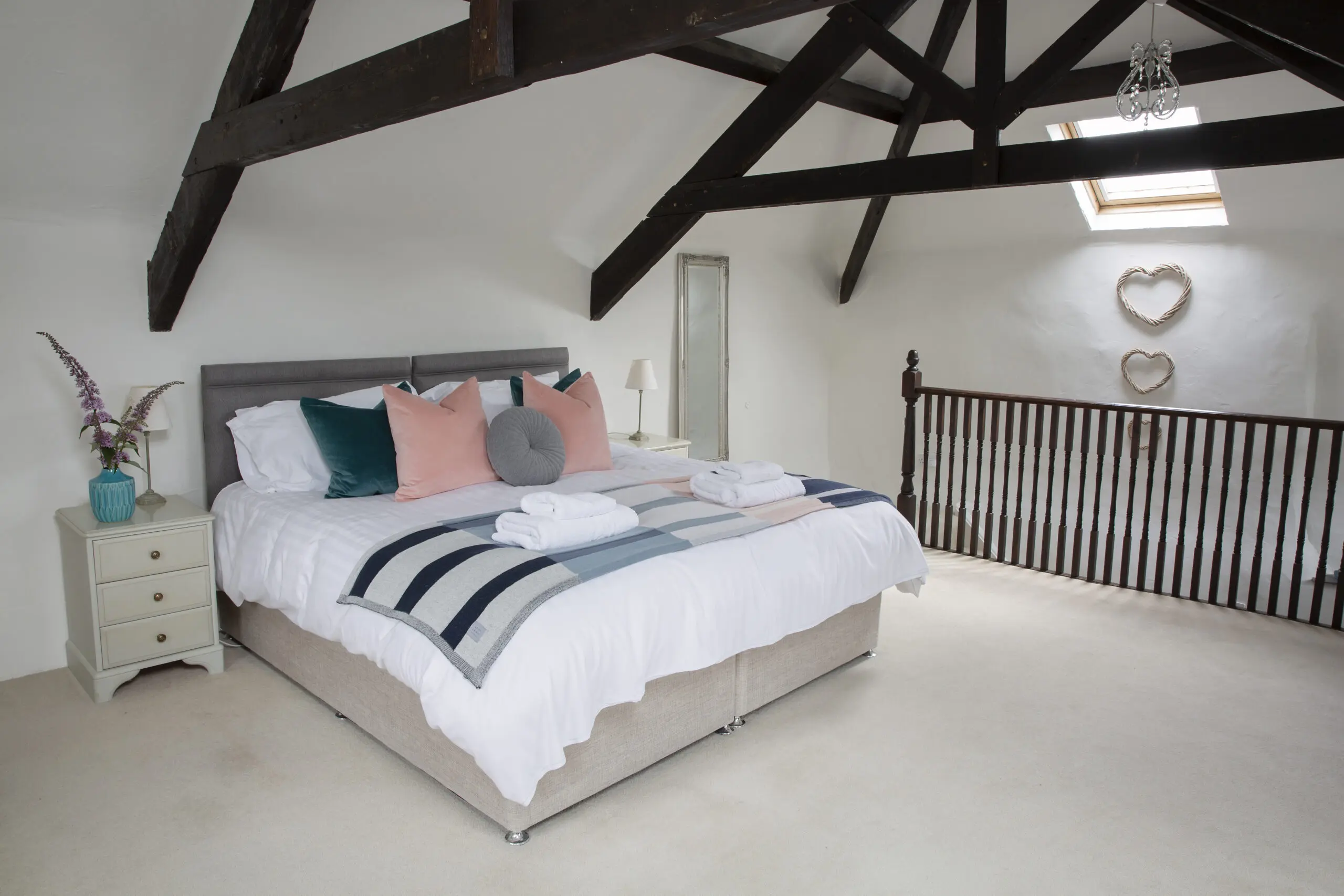 Upstairs, you’ll find a spacious and luxurious bedroom featuring a king-size link bed, TV, and charming beamed ceilings.