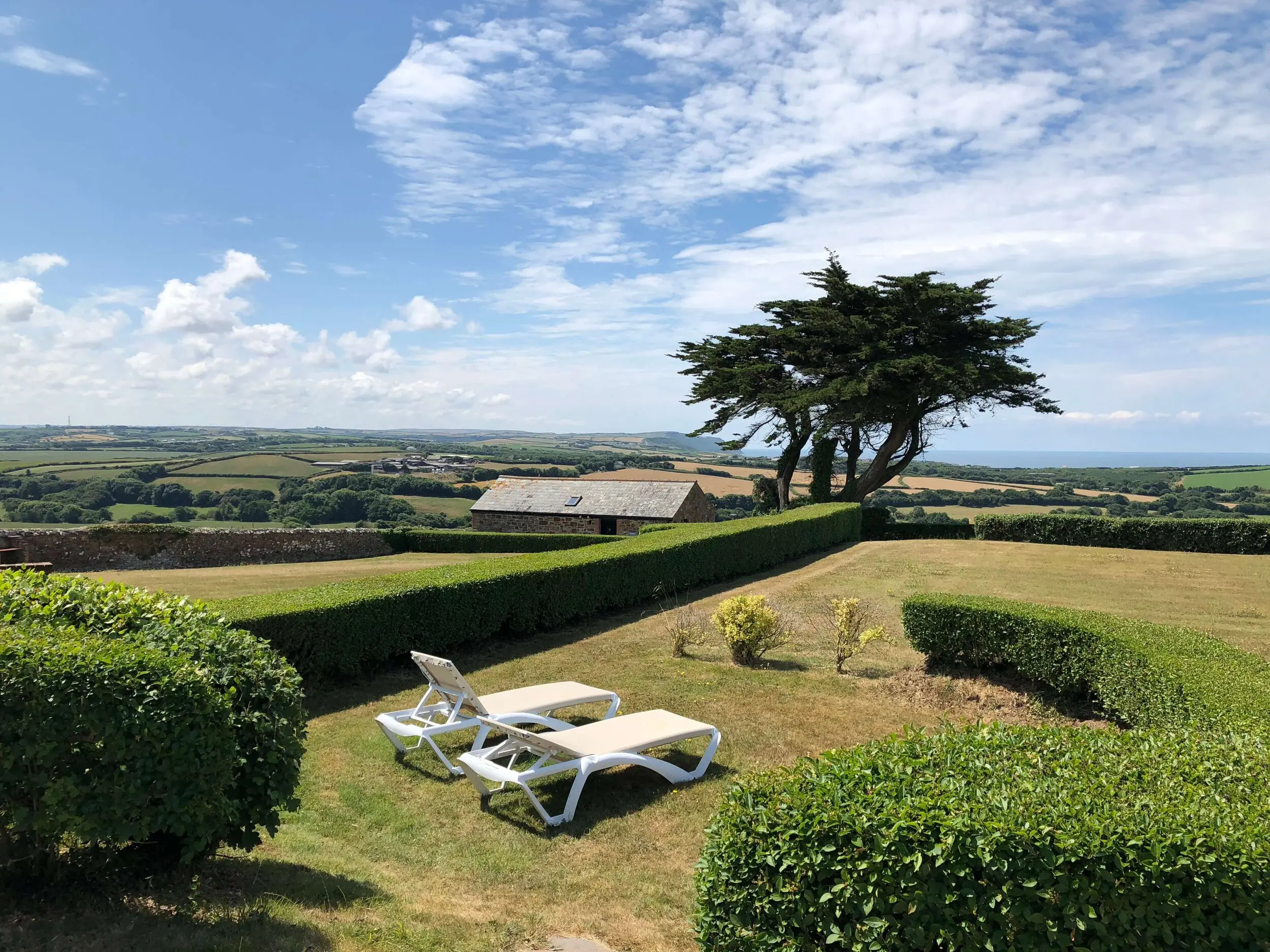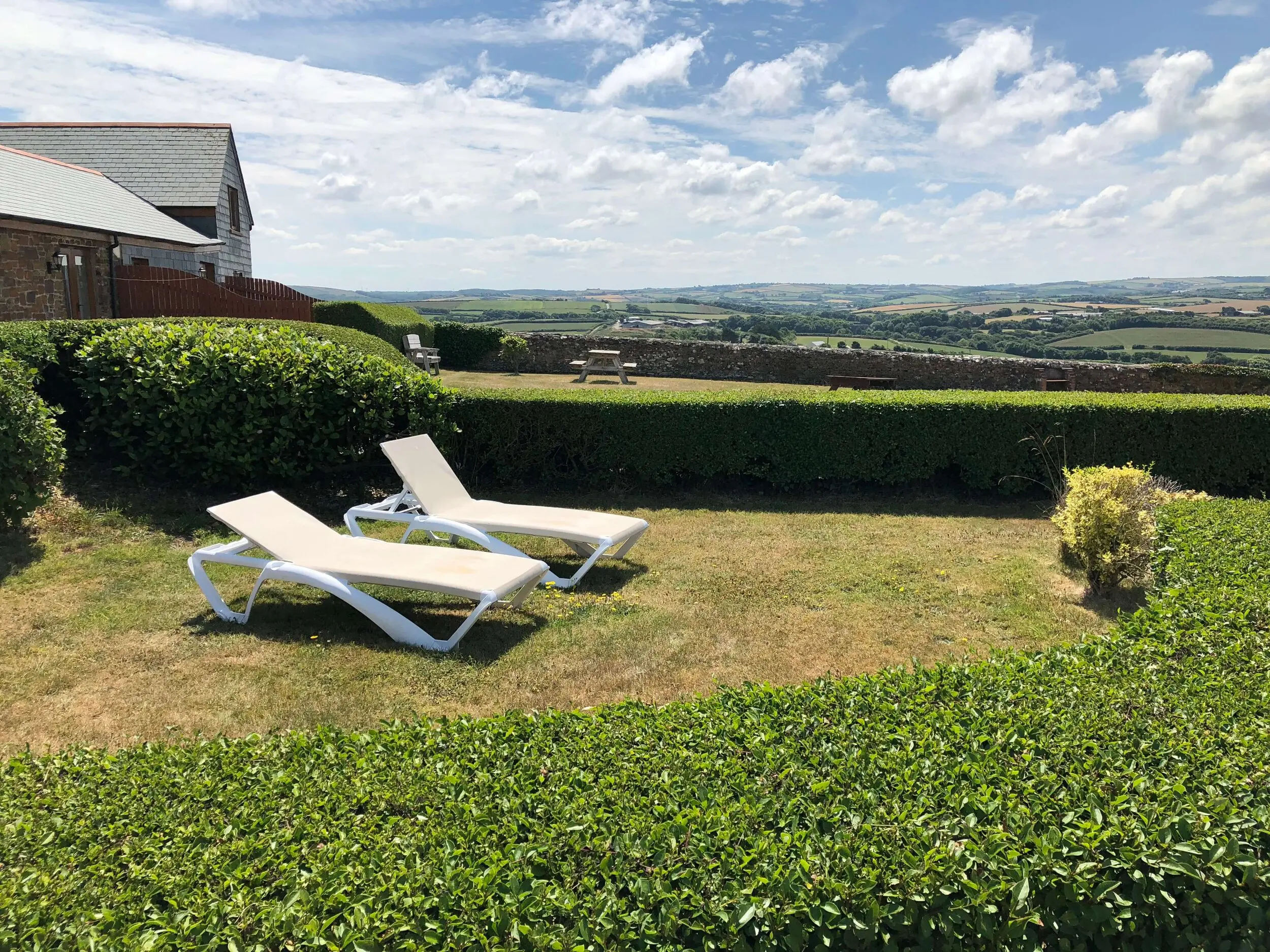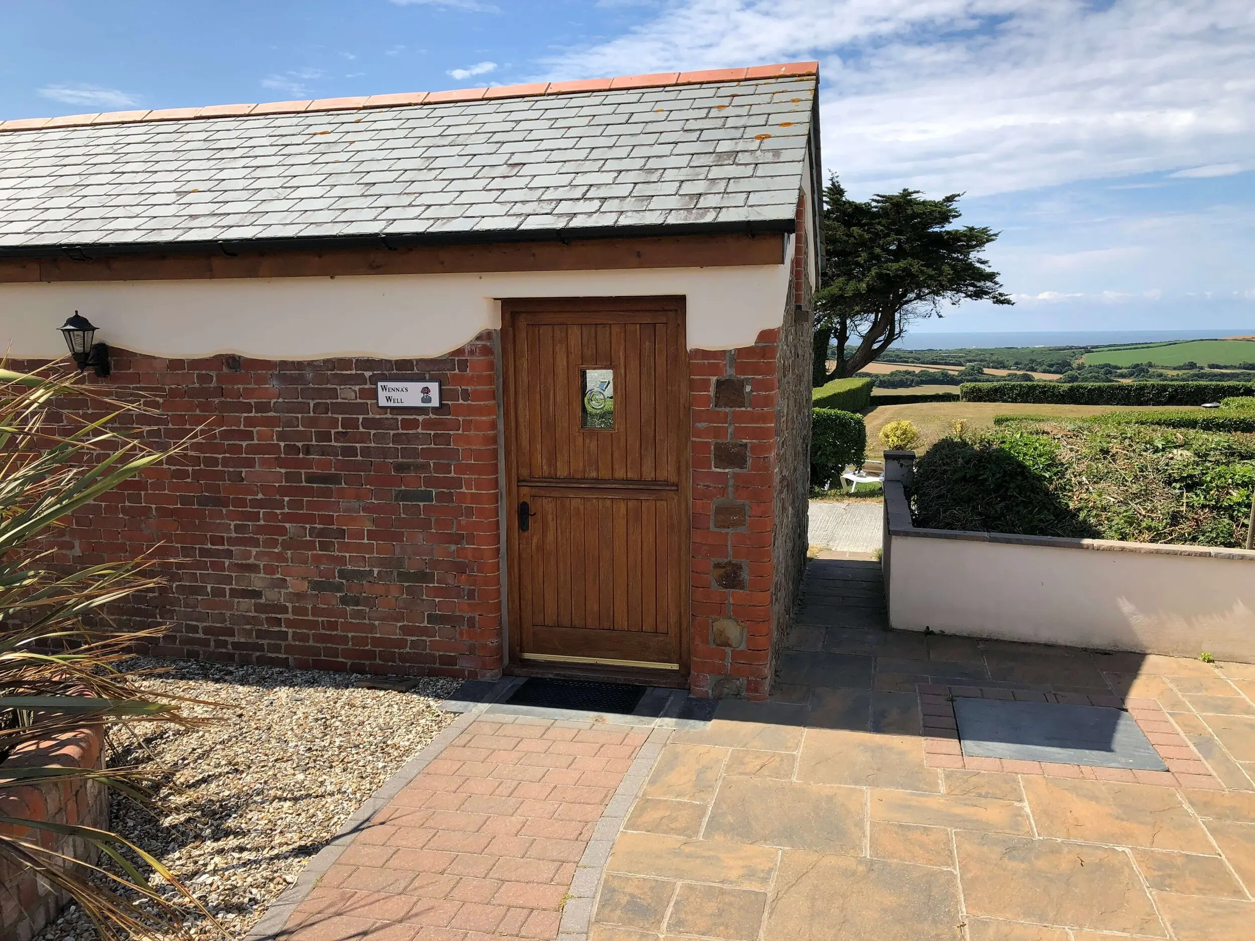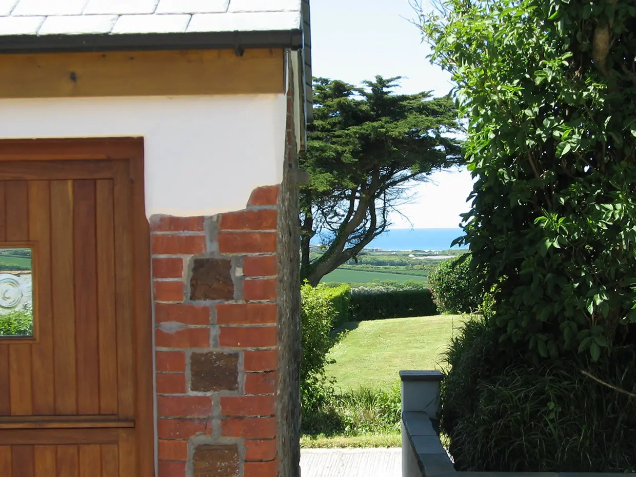 At the entrance, a patio area catches the morning sun and is paved with slate that once covered the old well — believed to have served a dwelling centuries ago. To the west, a garden corner with sun loungers offers sweeping countryside and sea views towards Widemouth Bay. Guests also have access to shared grounds with a BBQ area.