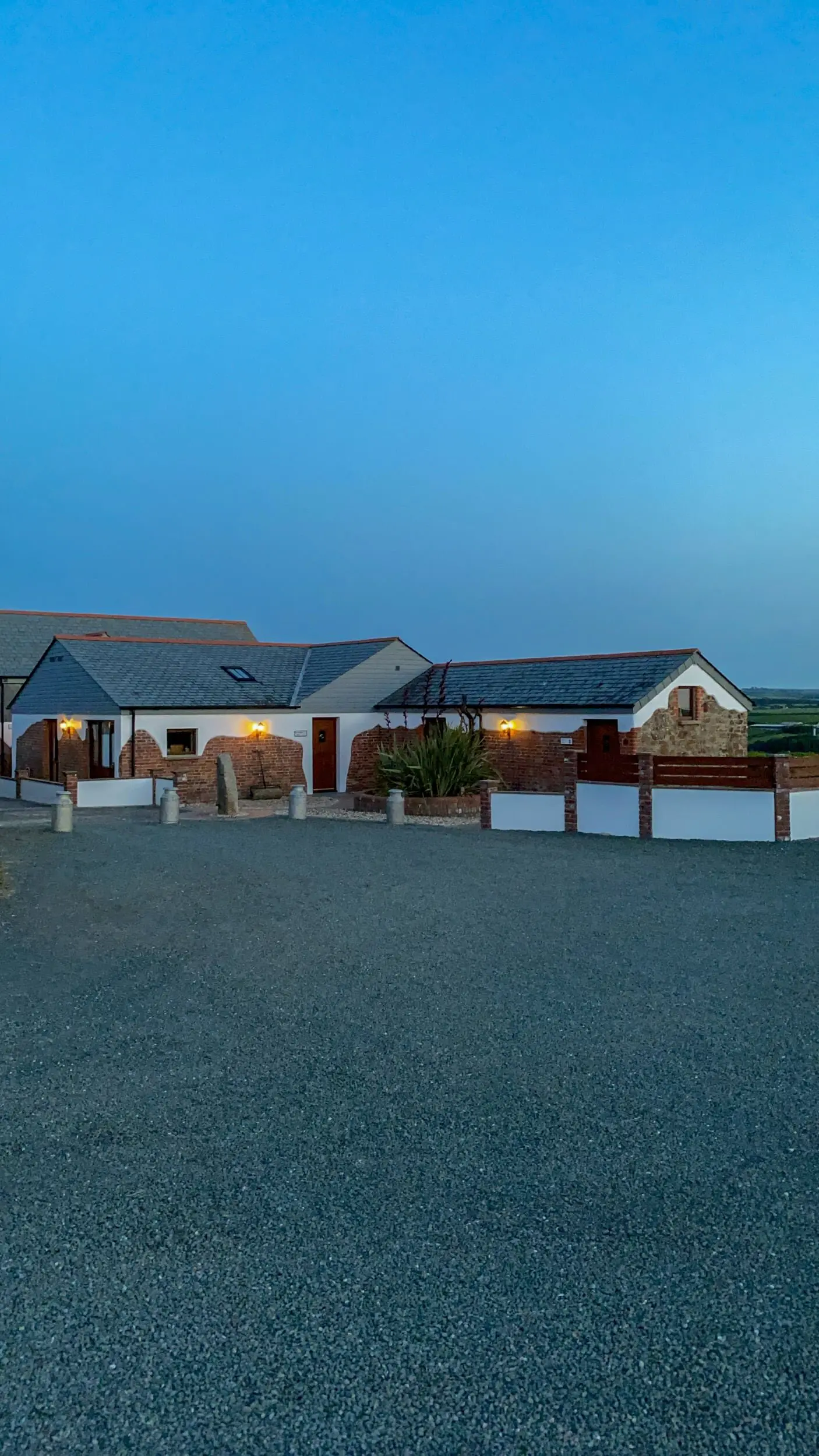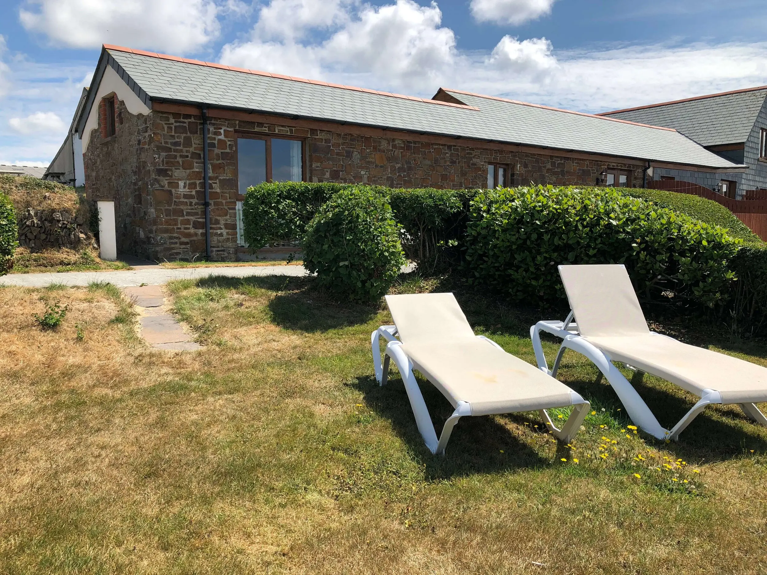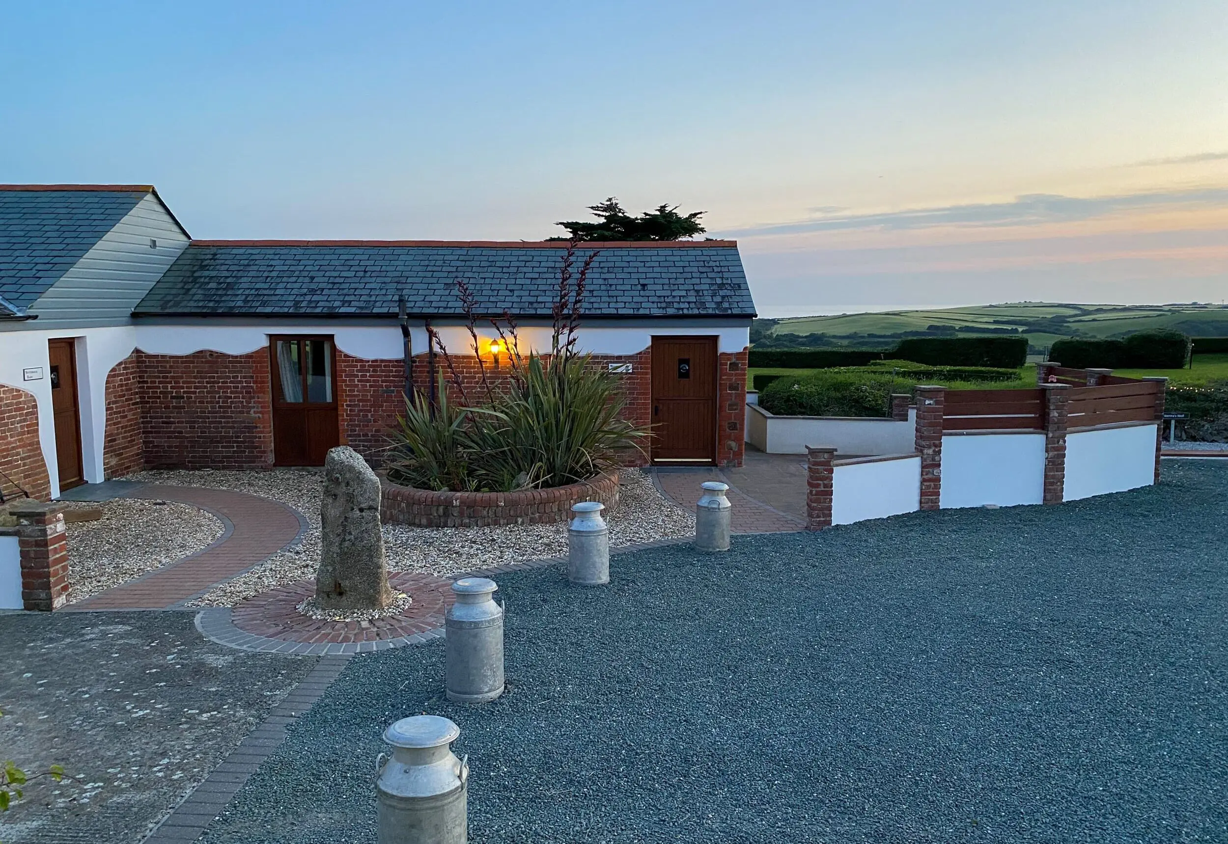 At the entrance, a patio area catches the morning sun and is paved with slate that once covered the old well — believed to have served a dwelling centuries ago. To the west, a garden corner with sun loungers offers sweeping countryside and sea views towards Widemouth Bay. Guests also have access to shared grounds with a BBQ area.