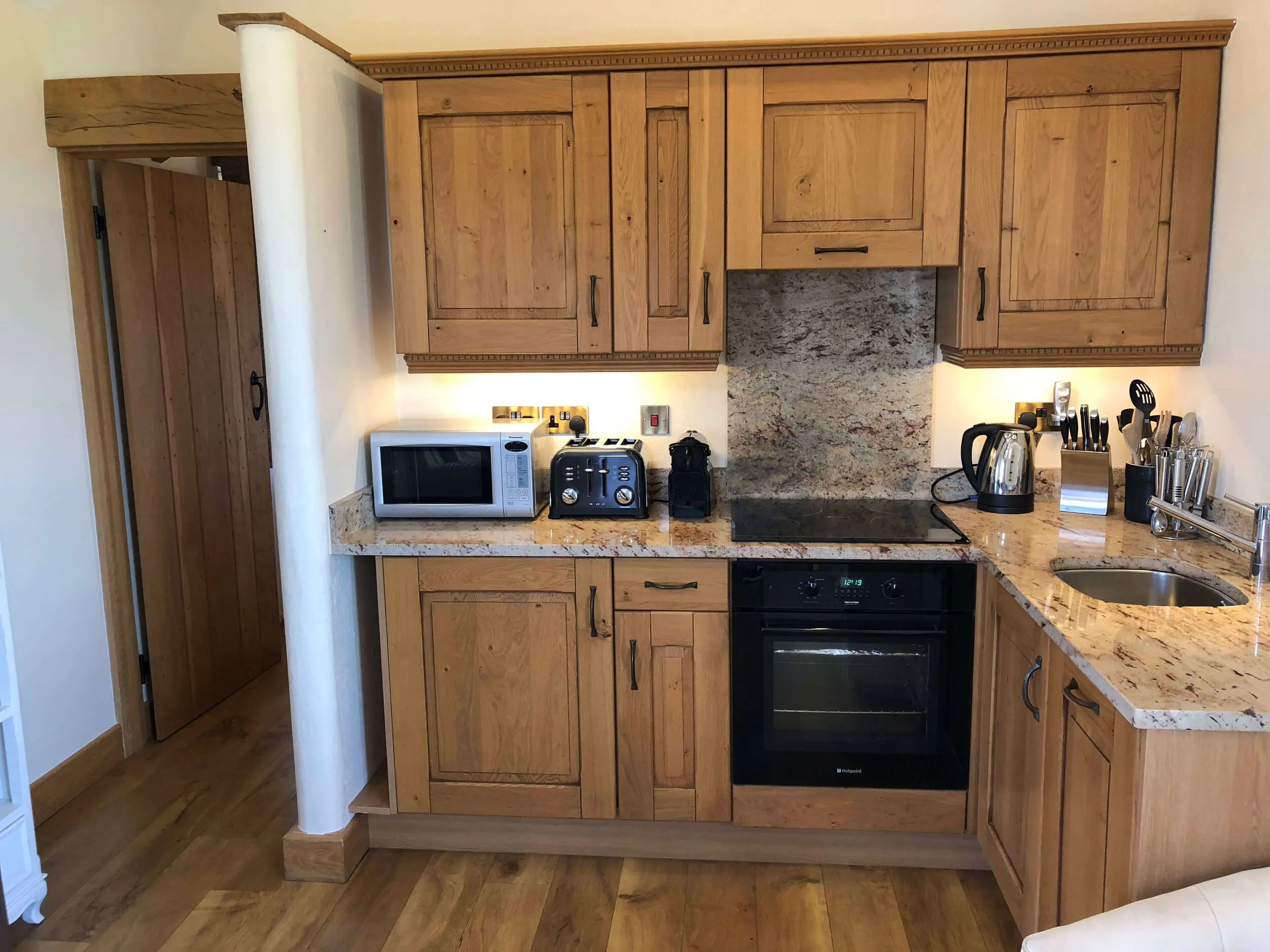 Compact yet fully equipped, the oak kitchen is finished with a cream and red-flecked granite worktop and includes everything you need for a comfortable stay:
