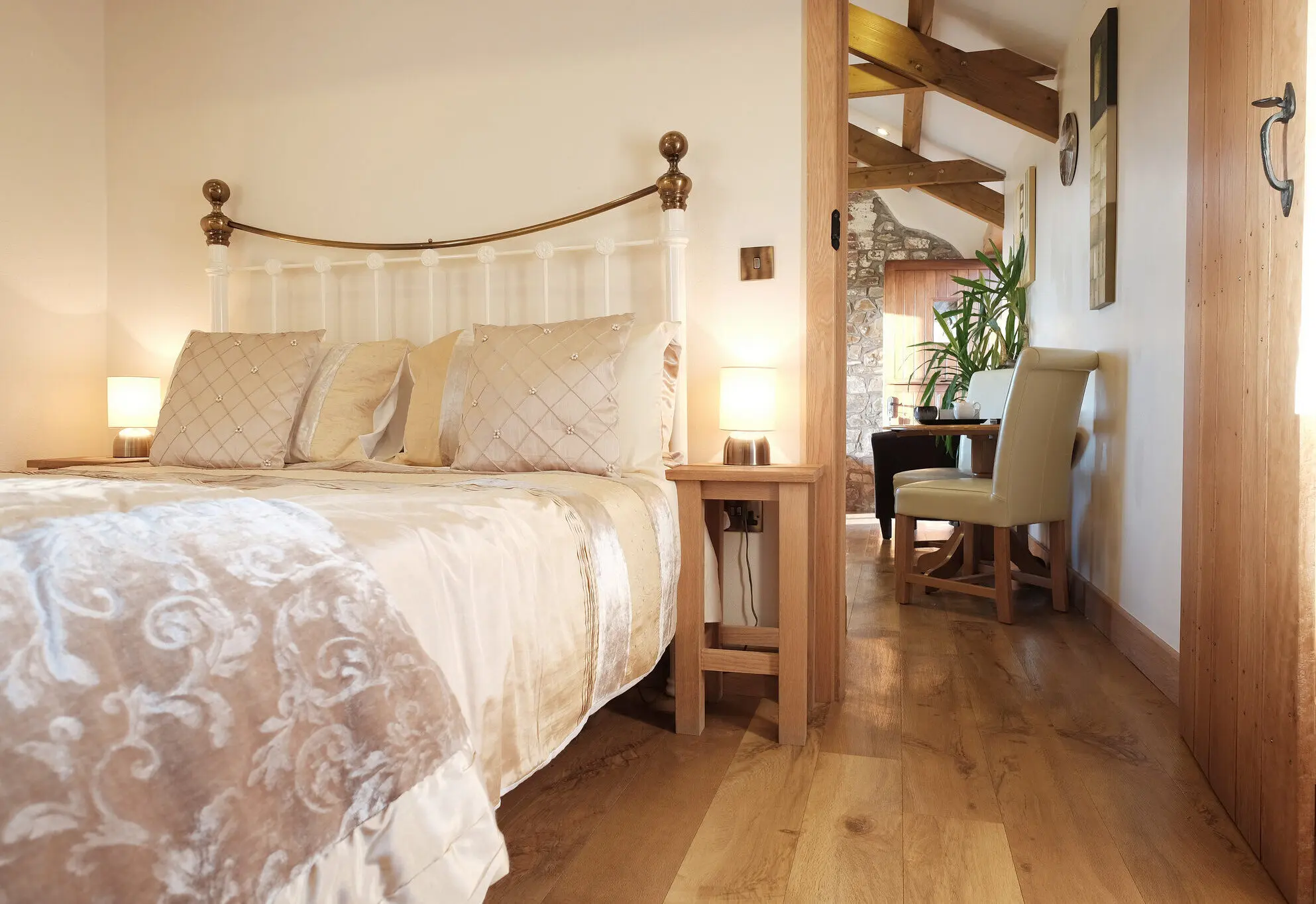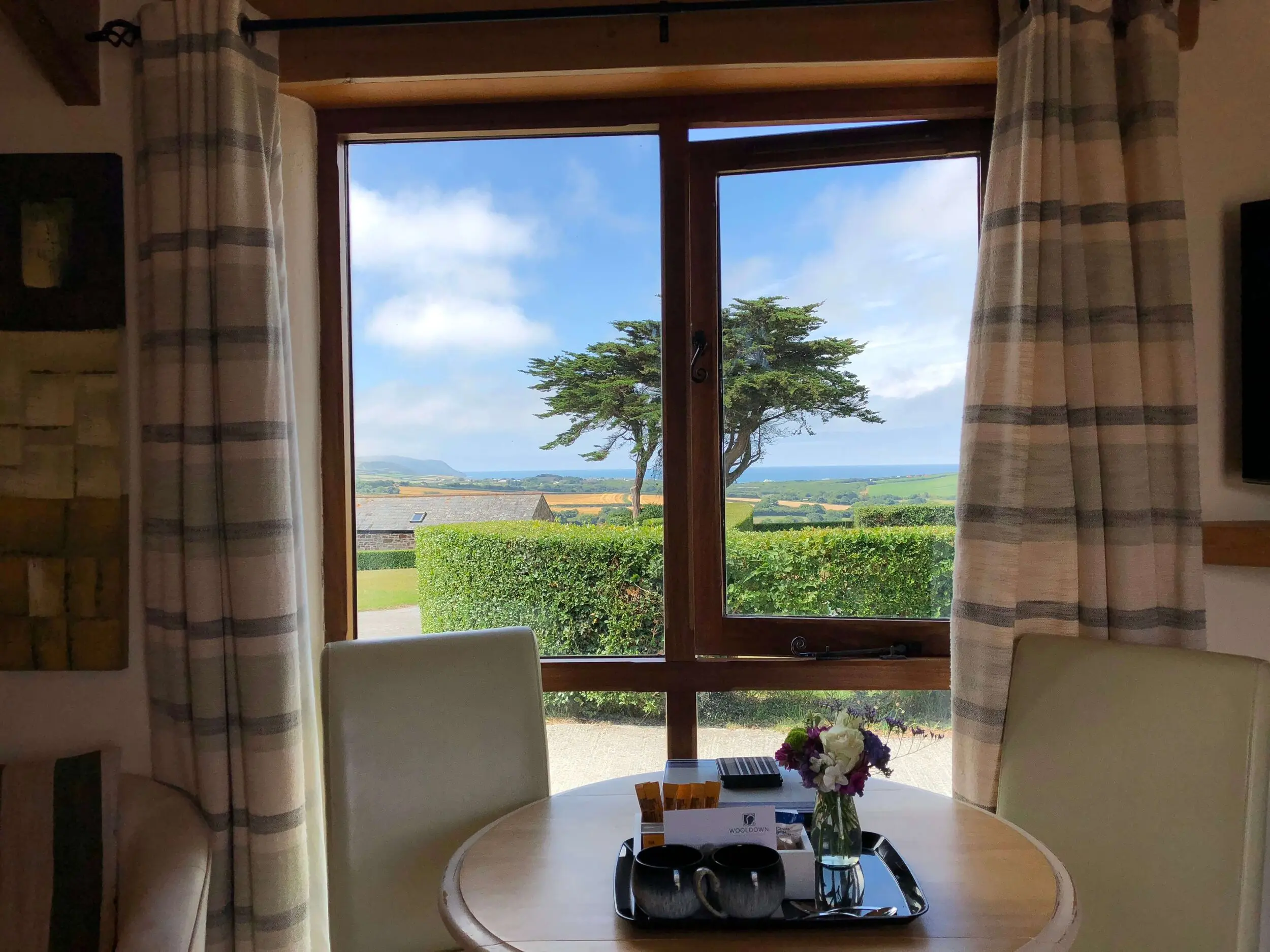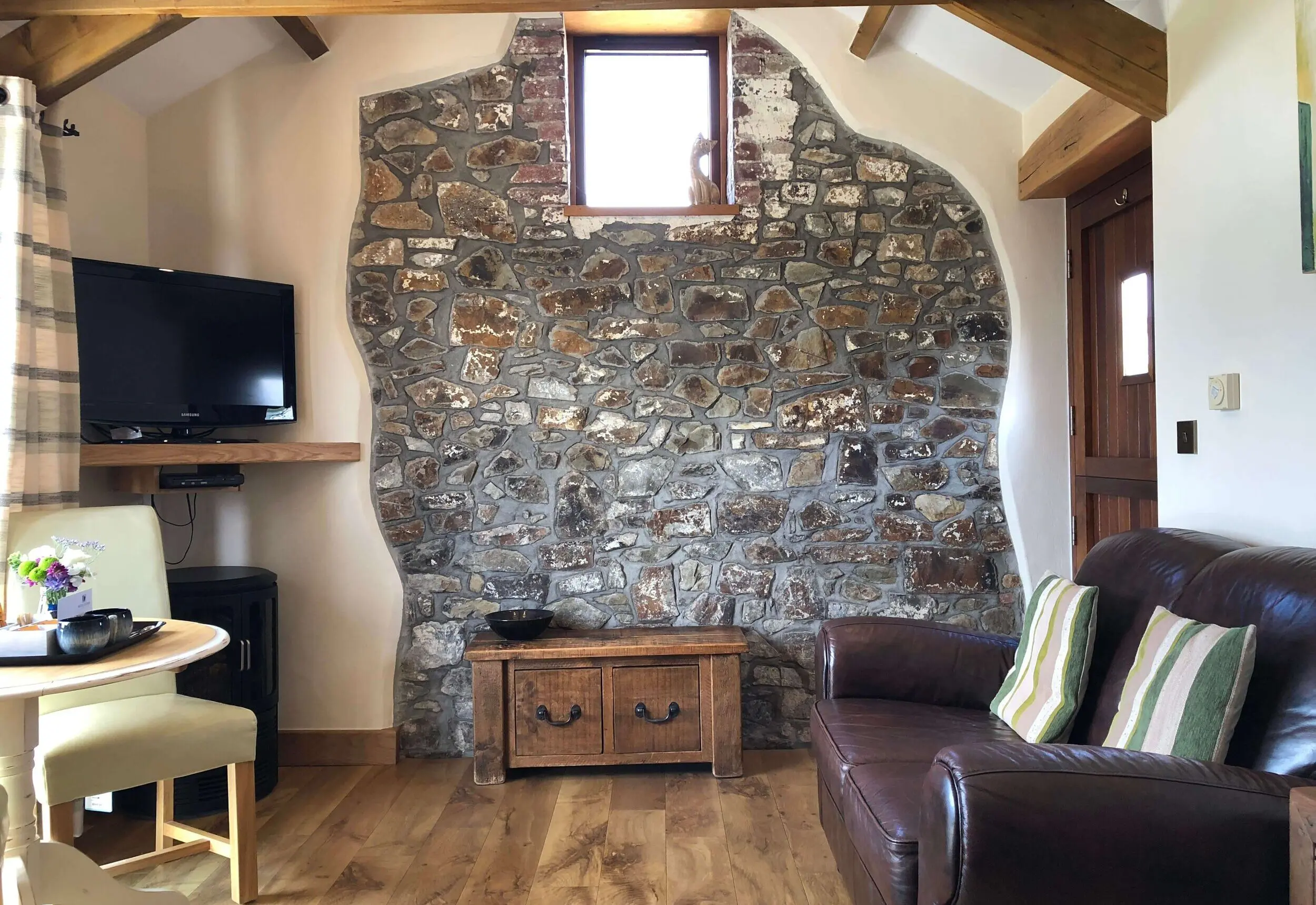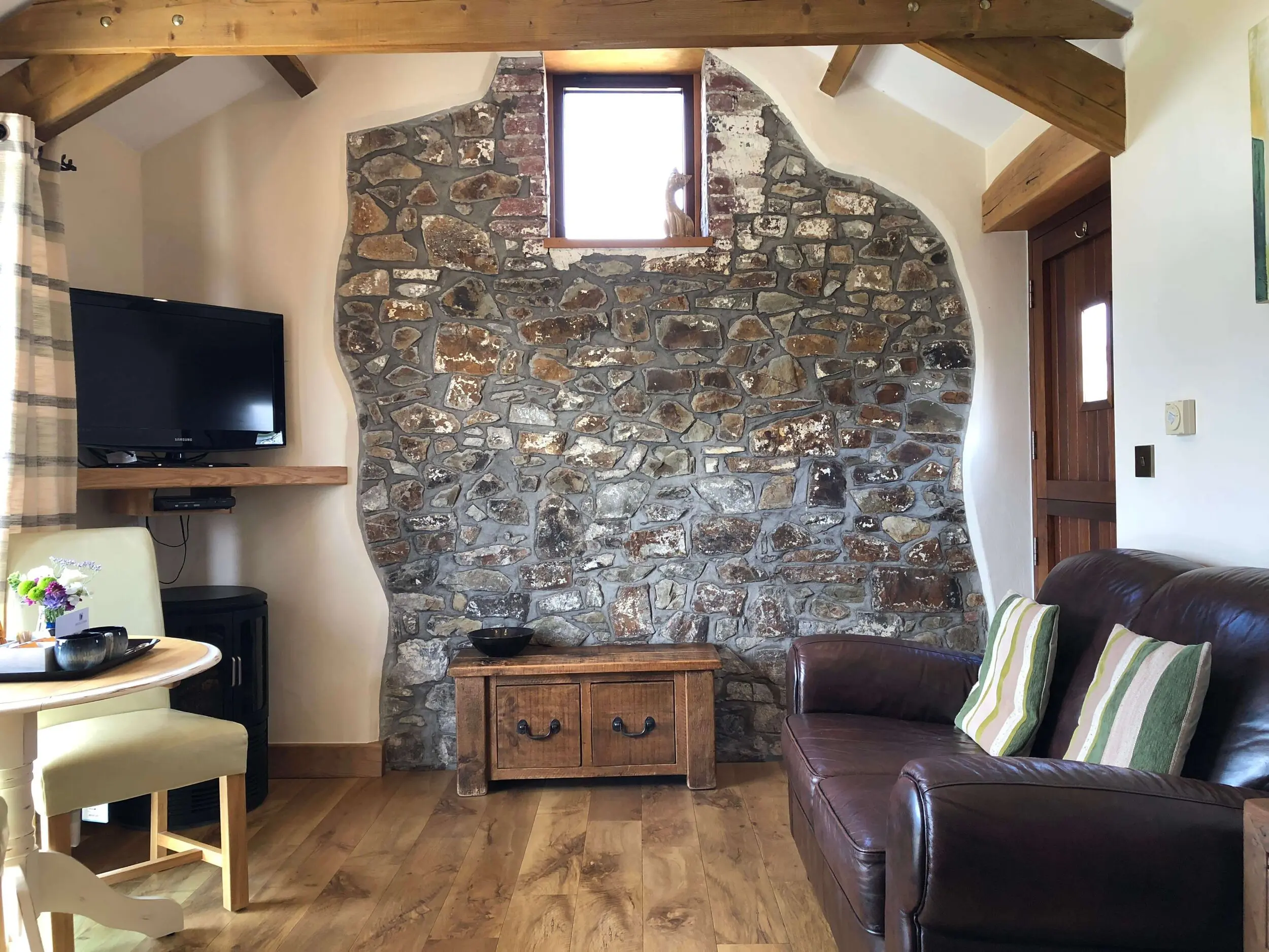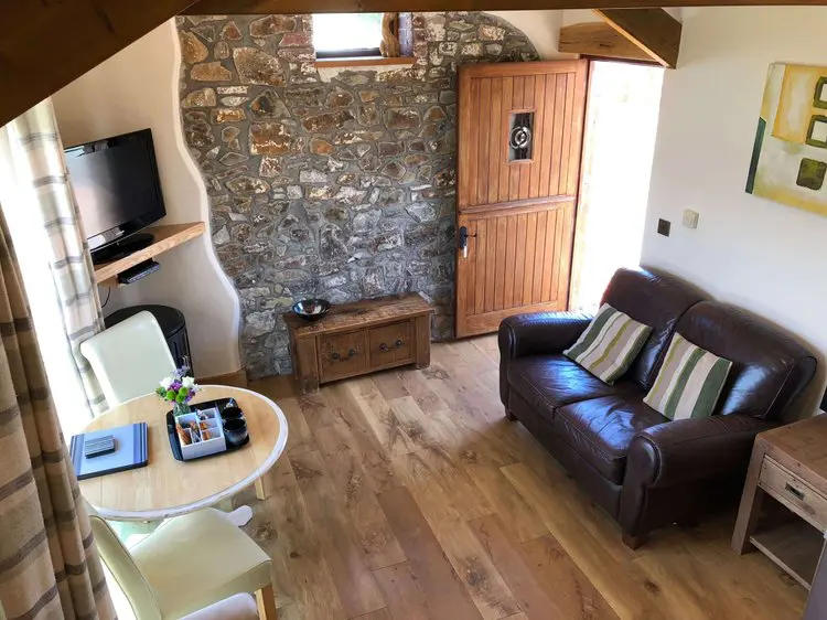 The living space blends tradition and modern comfort. An original stone wall has been left exposed, while open-beamed ceilings give the room authentic character. After a day exploring Cornwall, unwind as you watch the sun set over Widemouth Bay — the views from the windows are often breathtaking.