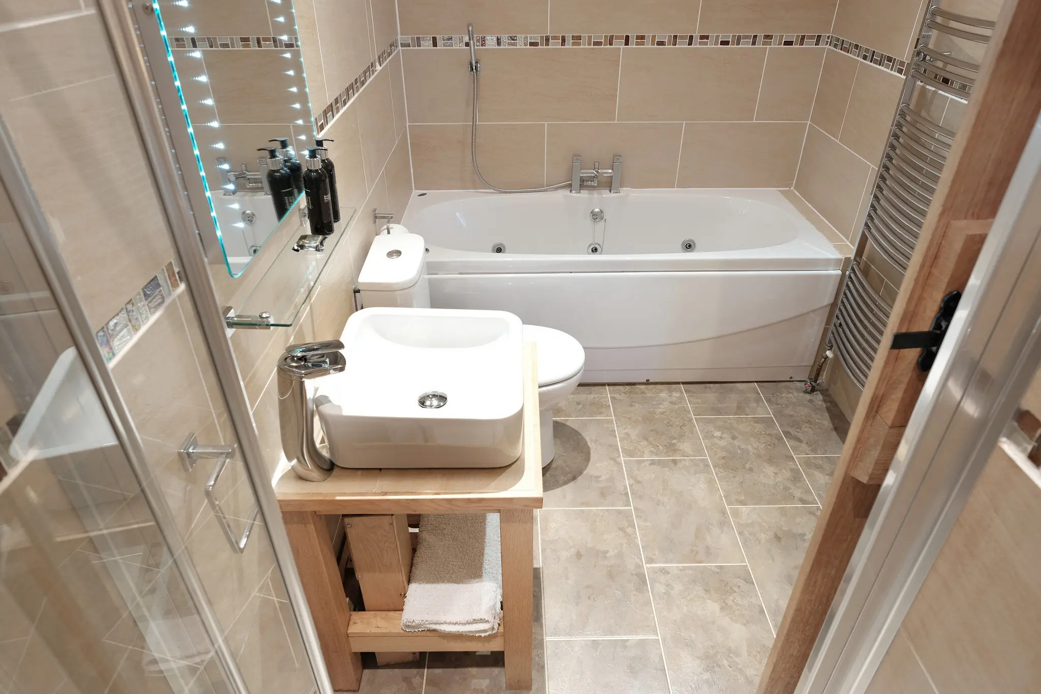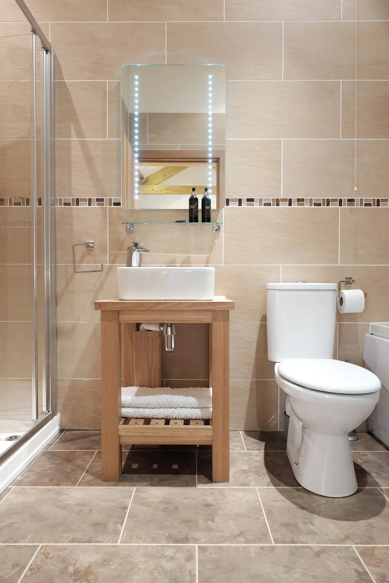 The en-suite bathroom combines modern luxury with indulgent touches, featuring a spa bath for long soaks and a separate walk-in rainfall shower. Locally made toiletries and bath foam are provided.