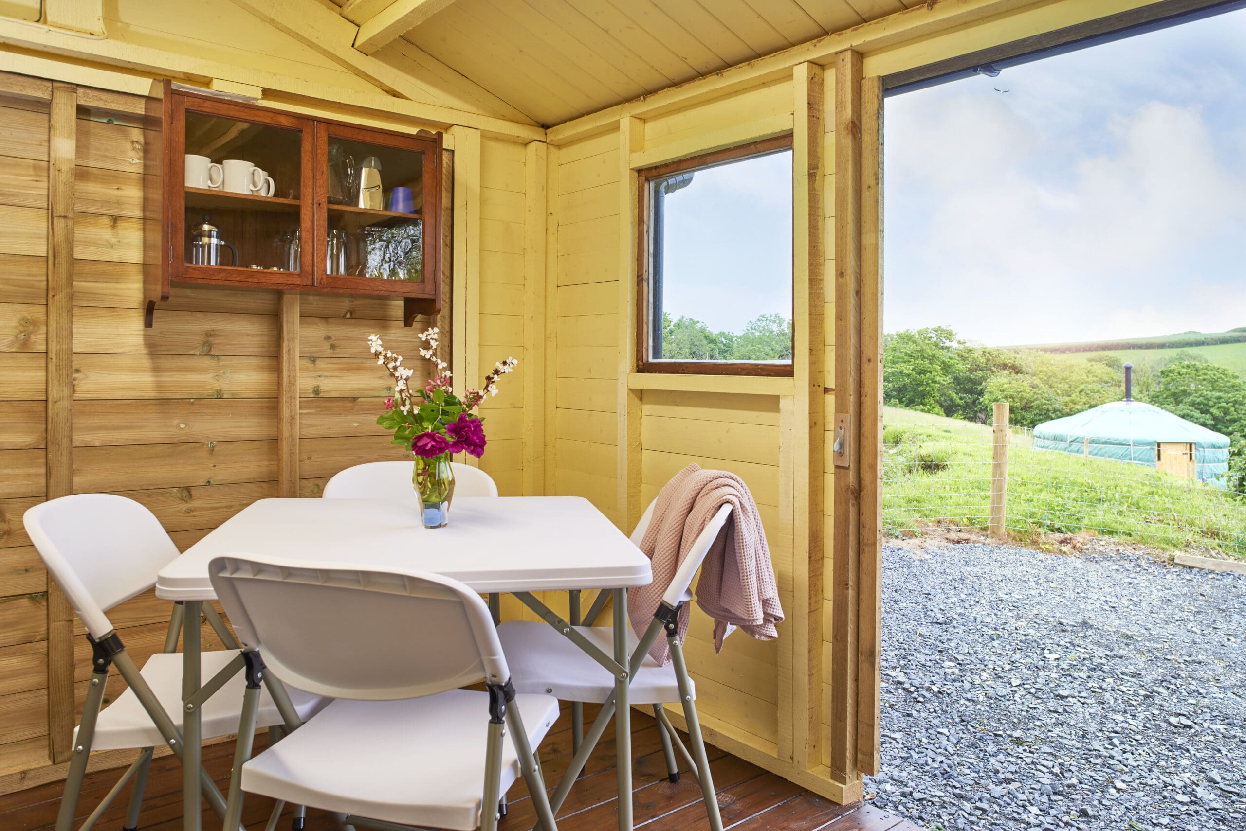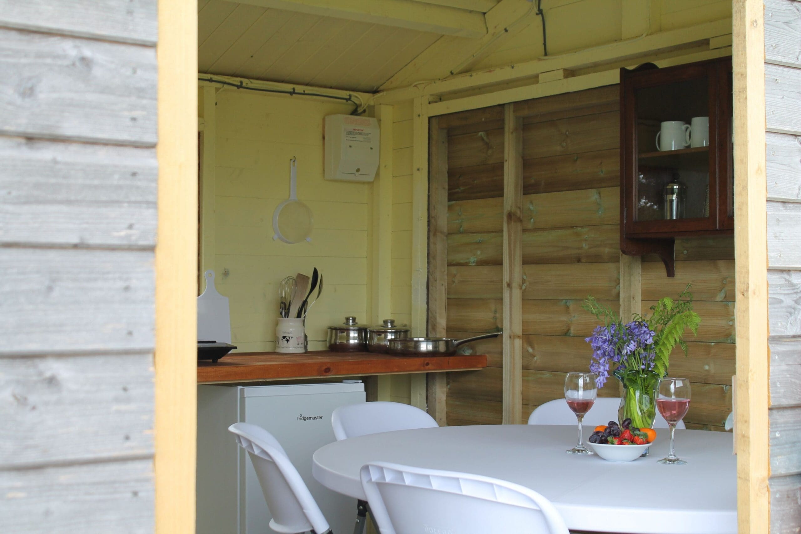Each yurt has its own kitchen area, which includes a fridge/freezer, microwave, toaster, electric kettle, and a two-ring induction hob. There is also a folding table and chairs, allowing guests to dine indoors if it’s raining. The kitchen area is equipped with two USB charging points for laptops, tablets, and phones. Each yurt is provided with a Weber BBQ and a covered outdoor area, so the BBQ can be used even in the rain.