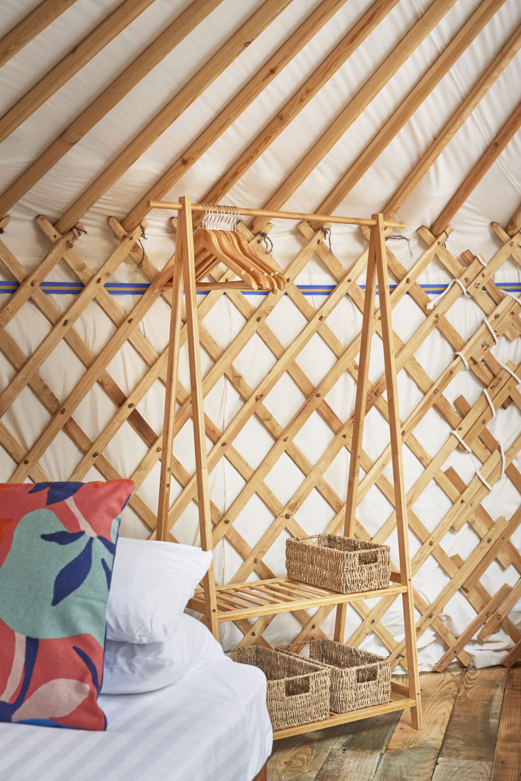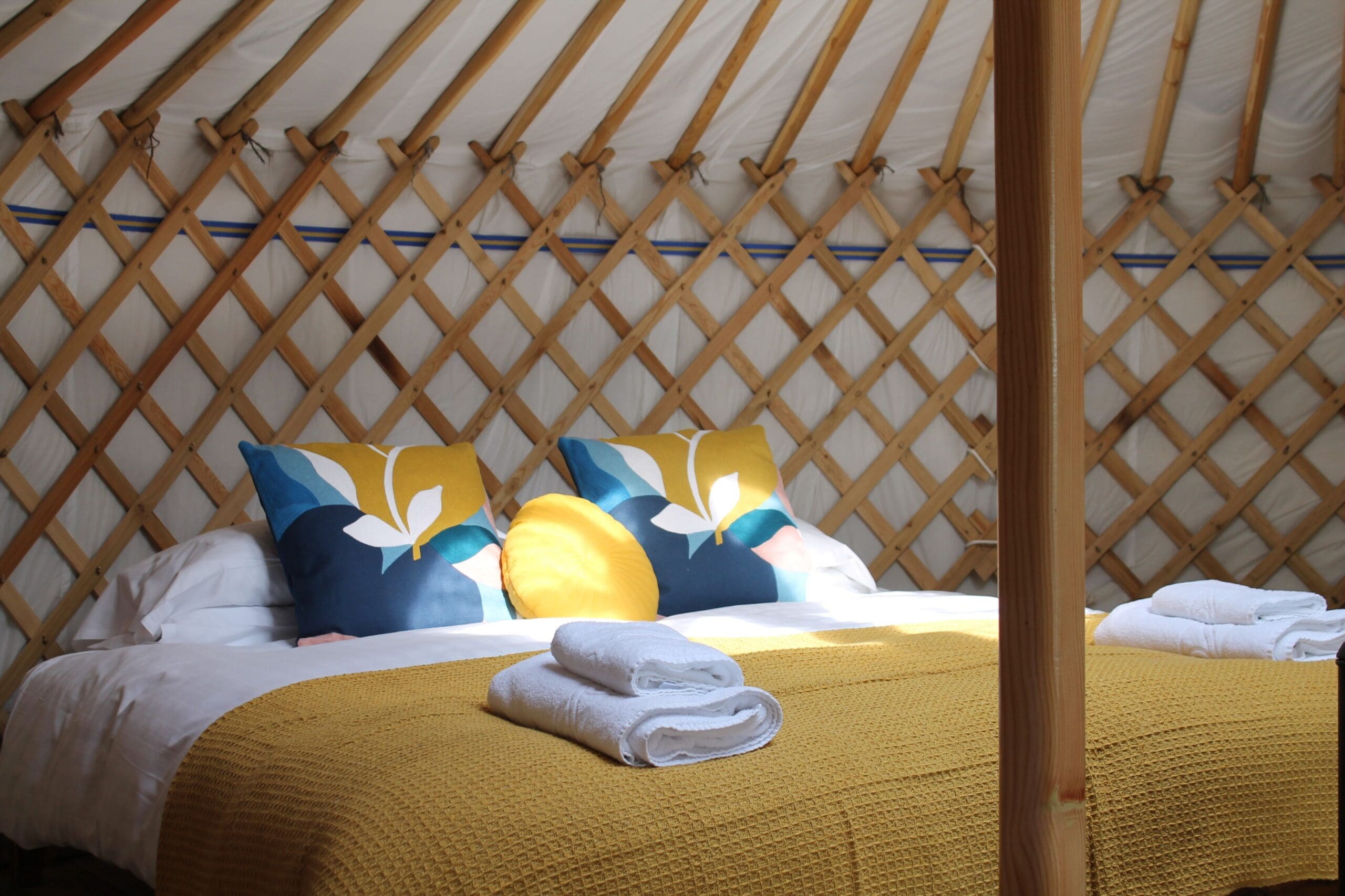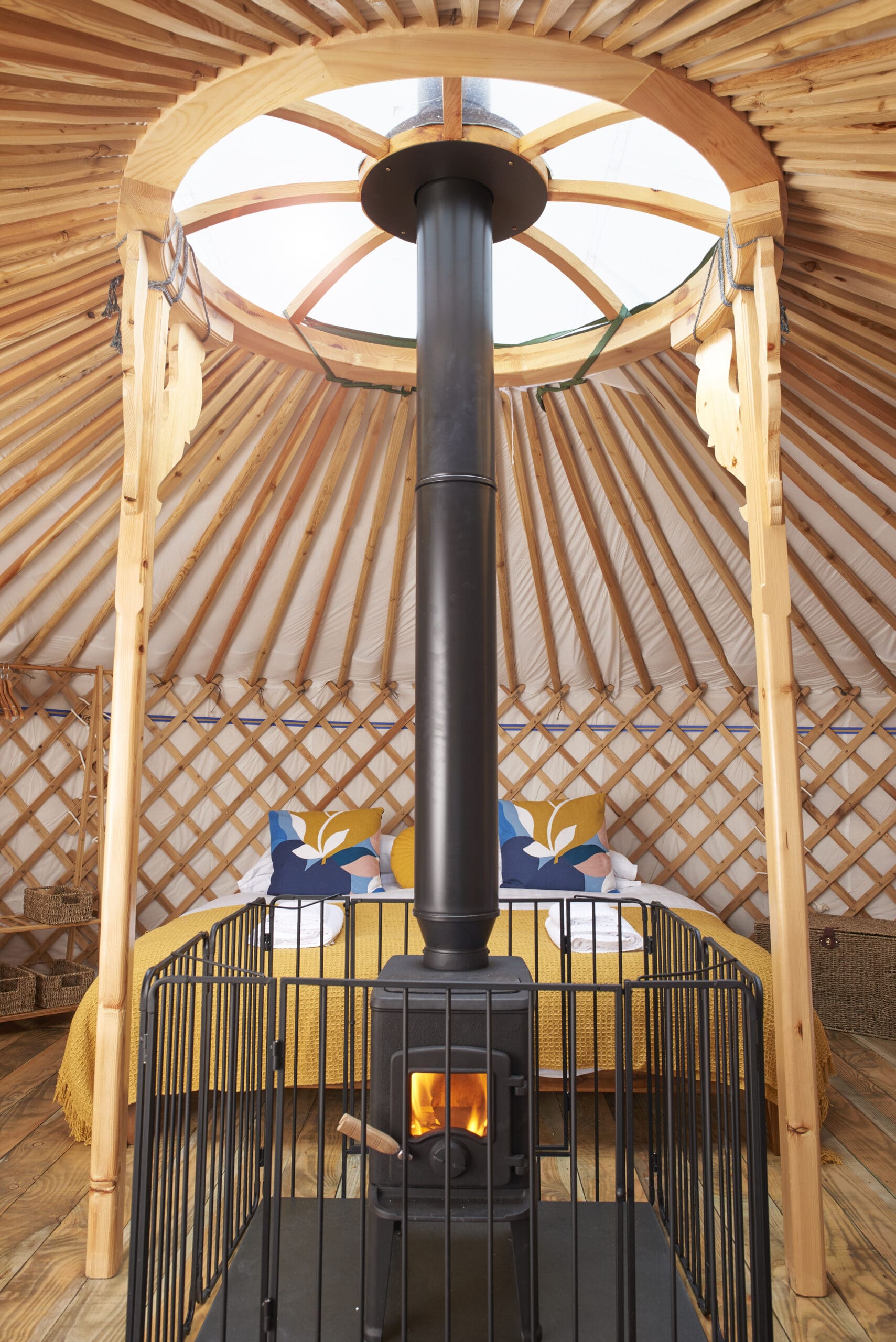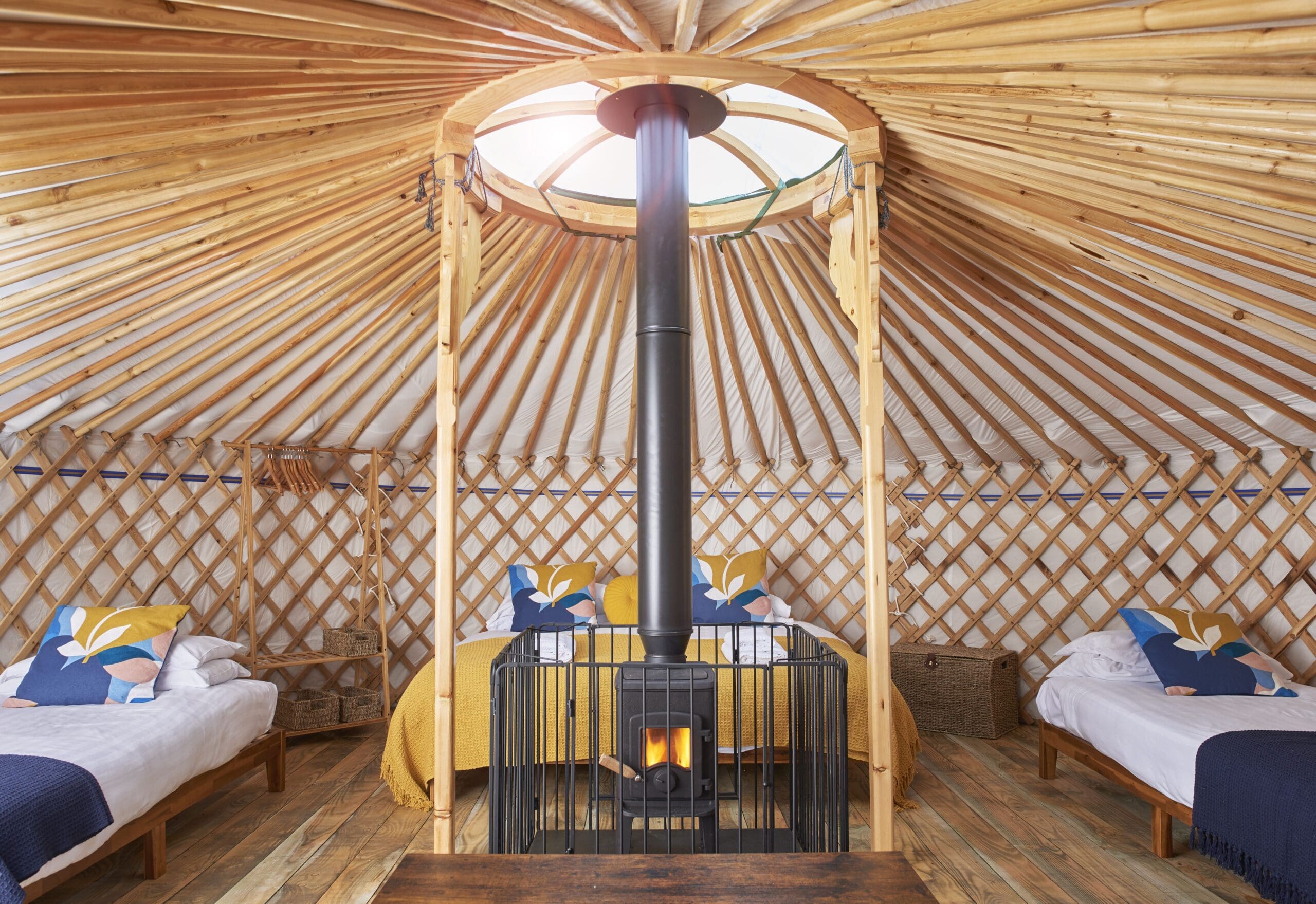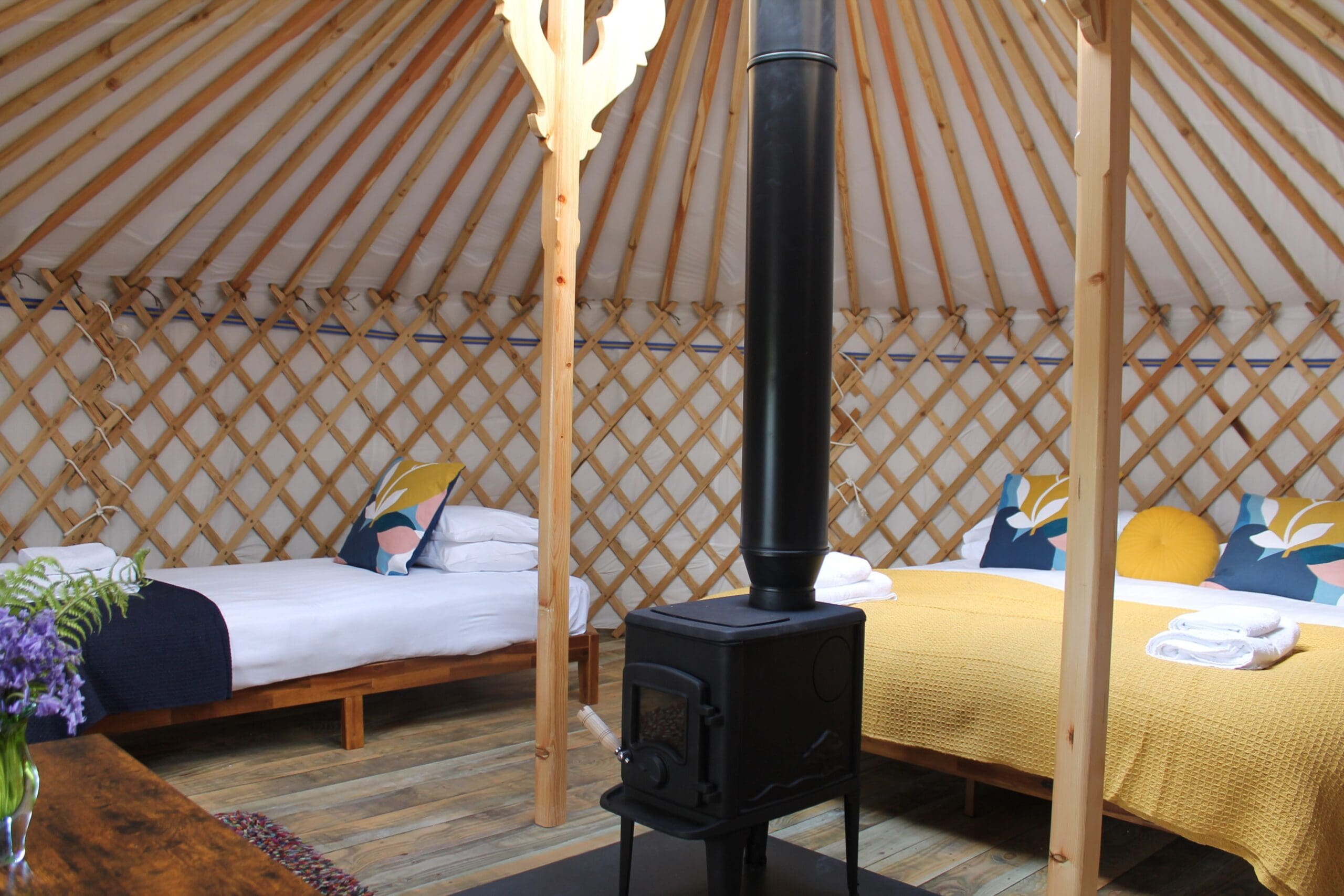 The yurts have a diameter of 5.8 metres and a central height of 3 metres. Each yurt is equipped with a super king-size (6ft) double bed and two single beds, as well as a high-end Nordpeis Orion stove at the centre. The beds are made up with crisp white linen, and each guest is provided with two pillows, a hand towel, and a fluffy bath sheet. Complimentary broadband Wi-Fi is available, and each yurt features a large picnic table just outside the door.