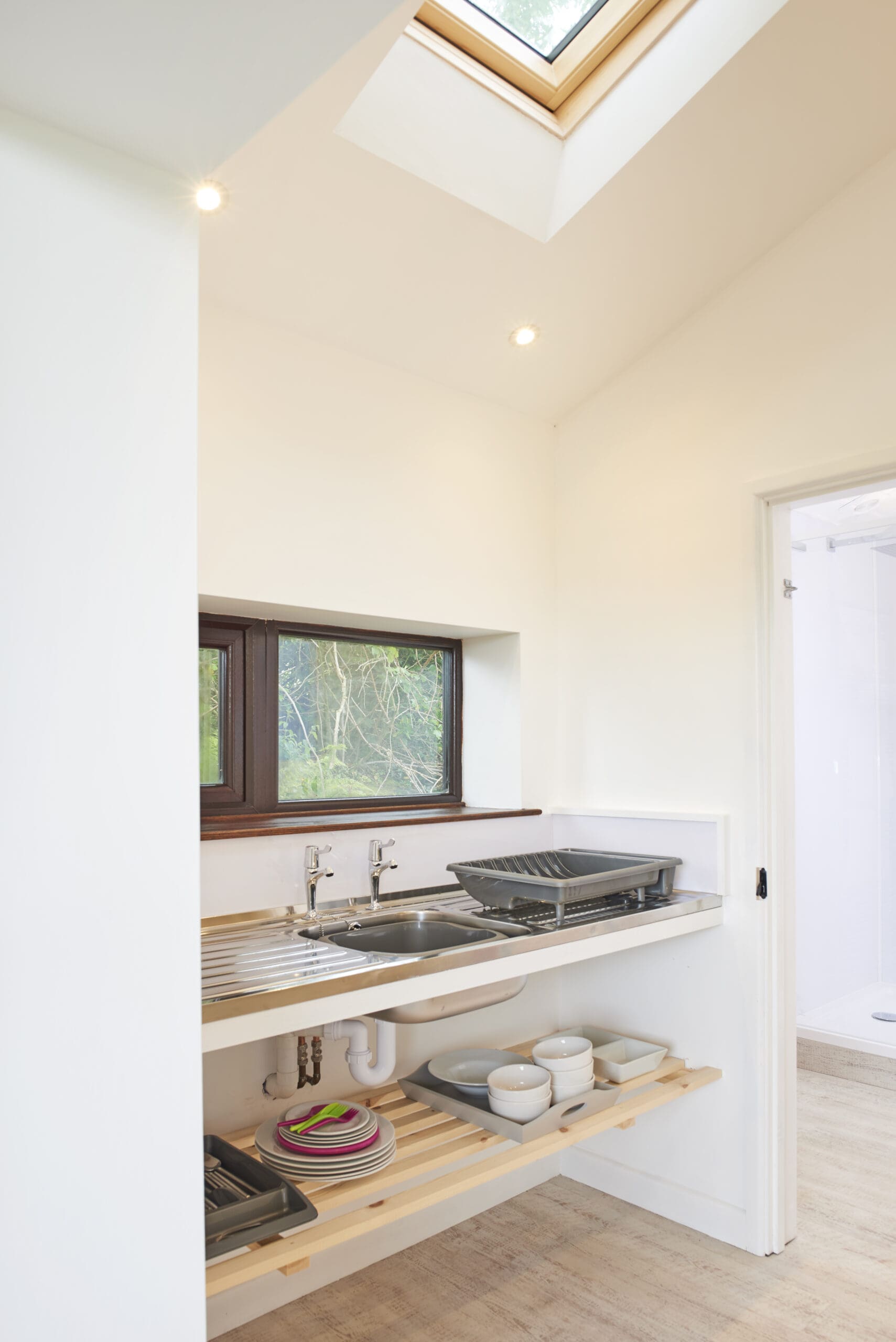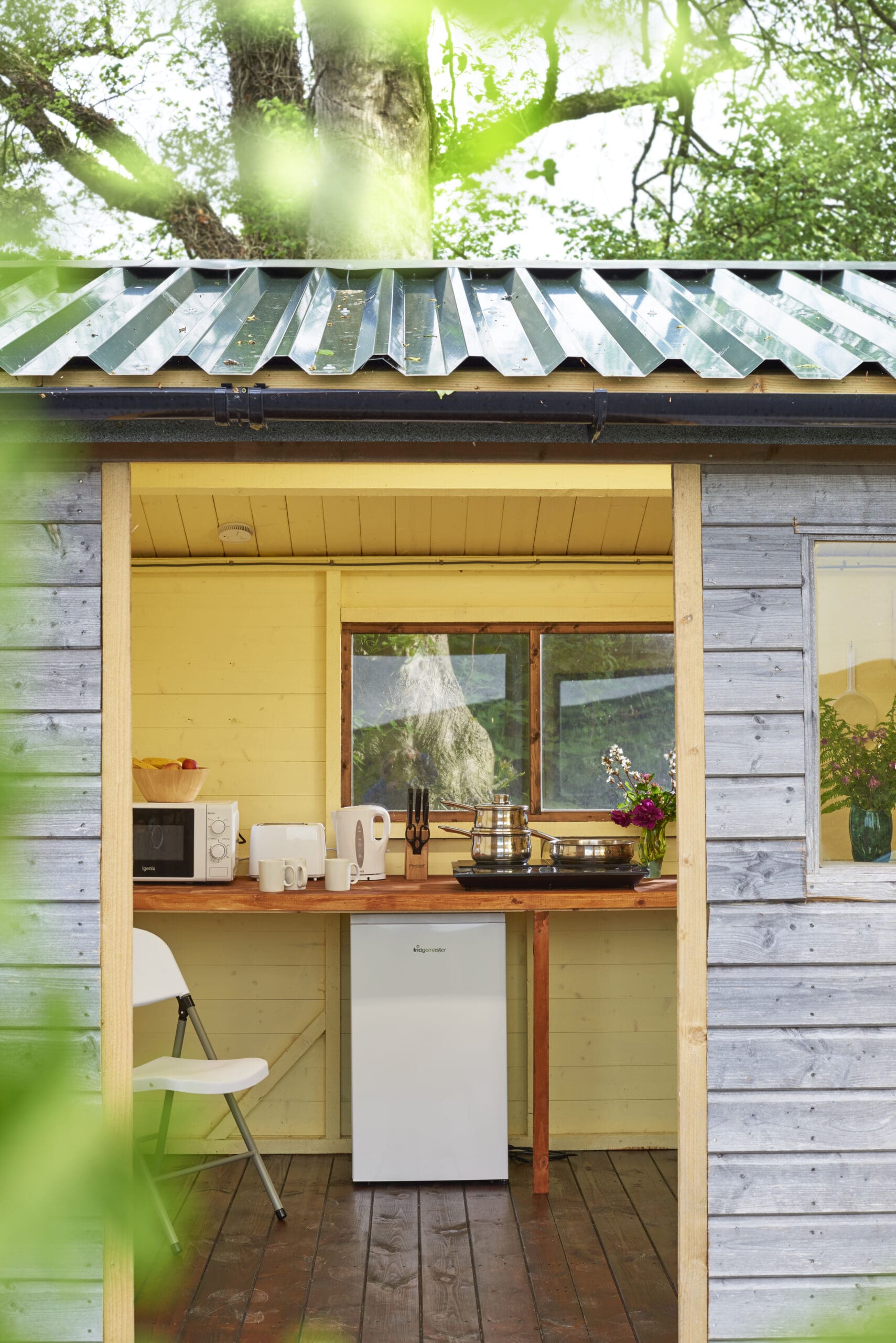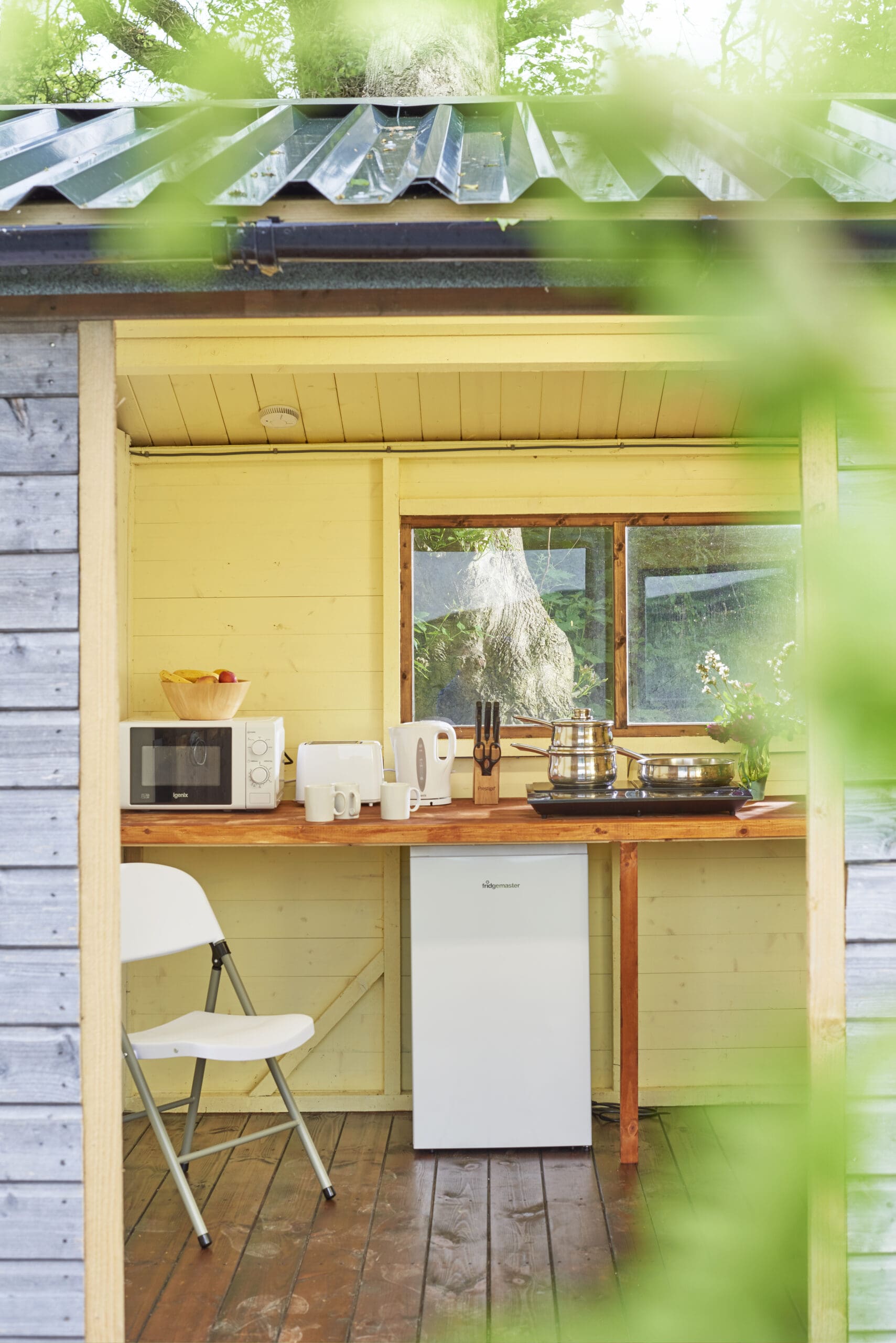 In addition to the kitchen facilities, each yurt has its own washing-up area, complete with frying pans, saucepans, cooking utensils, plates, bowls, mugs, glasses, and cutlery—essentially, everything you need to prepare and enjoy your meals.