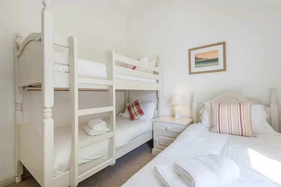 • A second bedroom with a single bed plus full-sized bunks, suitable for both adults and children (with space for a cot if needed)