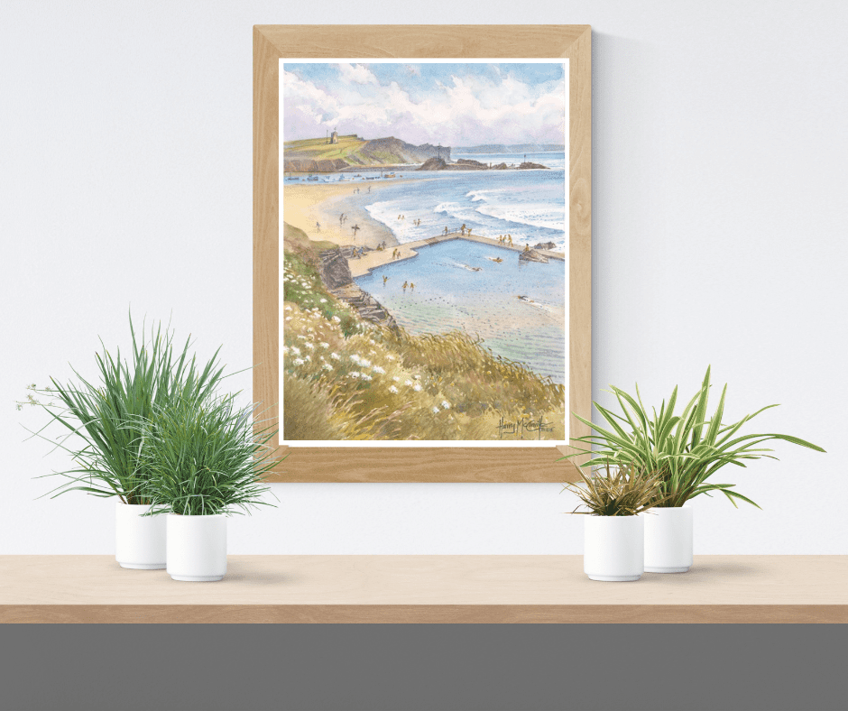 Local artist Harry McConville’s watercolour painting featuring Bude Sea Pool, one of Bude’s iconic locations.