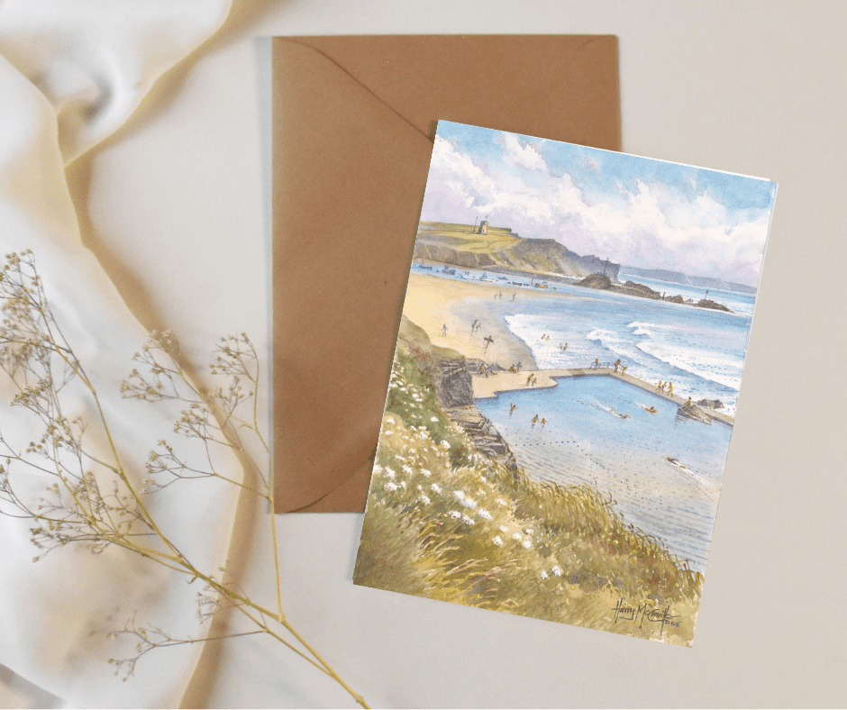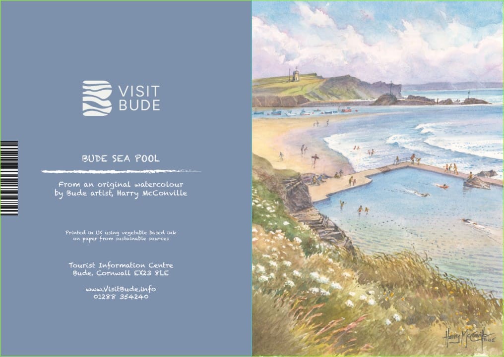 Local artist Harry McConville’s watercolour painting featuring Bude Sea Pool, one of Bude’s iconic locations.