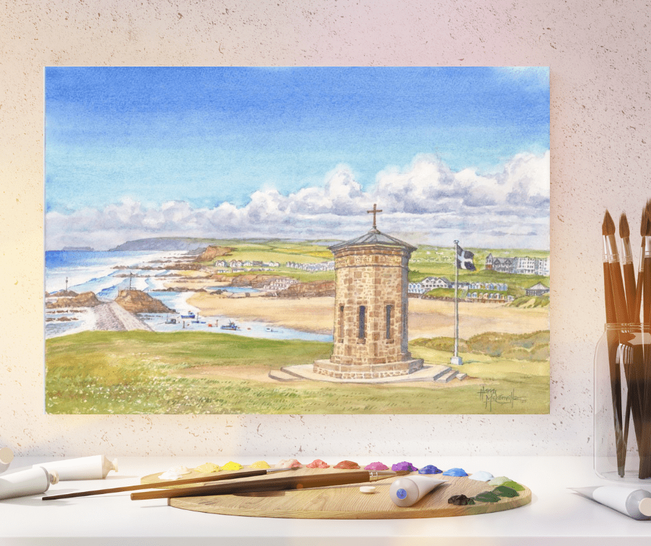 Local artist Harry McConville’s watercolour painting featuring the Storm Tower and Bude Sea Pool, two of Bude’s iconic locations.