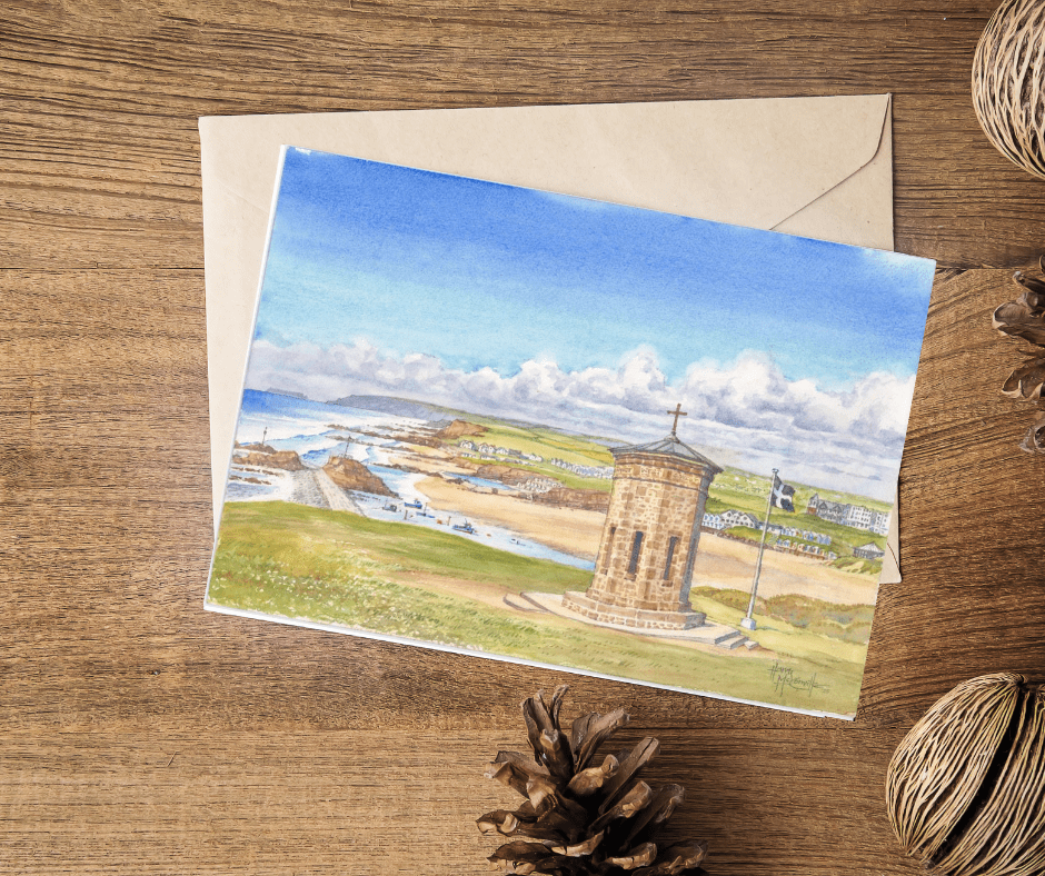 Local artist Harry McConville’s watercolour painting featuring the Storm Tower and Bude Sea Pool, two of Bude’s iconic locations.